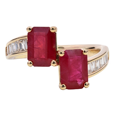 A brand-new, unused, certified natural diamond & ruby toi et moi ring, with two emerald-cut ruby gemstones to the centre & a cluster of baguette-cut diamonds to the shoulders, set in 18ct yellow gold.