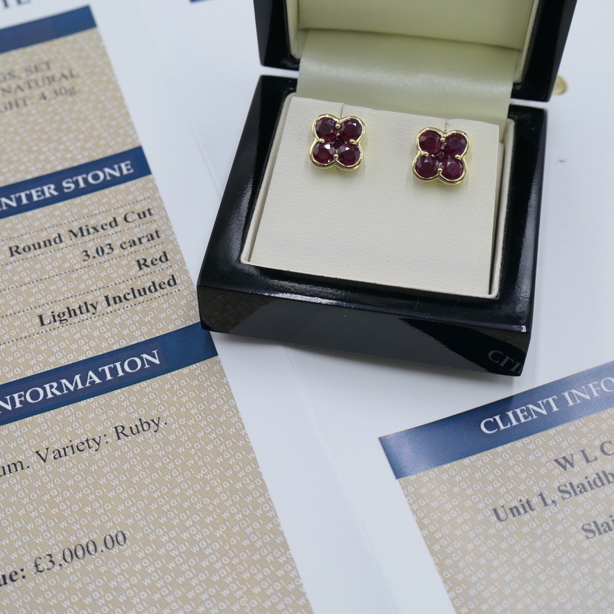 A brand-new, unused certified pair of ruby gemstone clover-shaped earrings that radiate colour, craftsmanship, and timeless charm. Each earring is set with five round, mixed-cut natural rubies, totalling an impressive 3.03 carats. The rubies display a deep, velvety red hue — a colour long associated with love, passion, and vitality. Their captivating intensity and well-balanced saturation create a mesmerising play of light, showcasing the beauty and allure that make natural rubies so highly prized. Carefully matched and expertly set, the gemstones form an elegant clover motif symbolising good fortune and harmony.