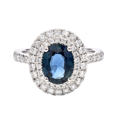 A brand-new, unused, certified natural diamond & teal sapphire oval-shaped cluster ring, with one oval-cut teal sapphire gemstone at the centre & a cluster of brilliant-cut diamonds in a double halo setting & to the shoulders, set in platinum.