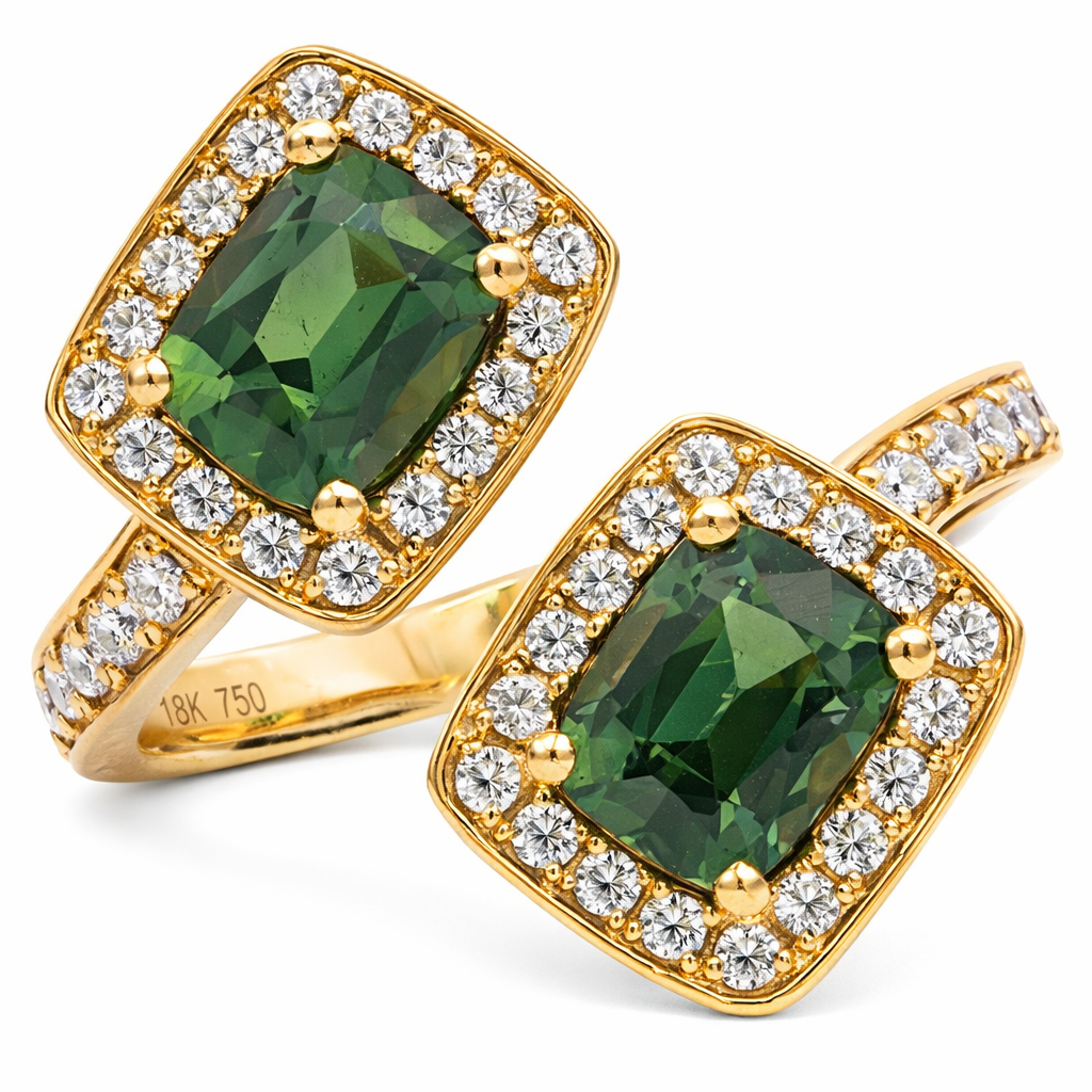 The diamonds total 0.50ct and are carefully arranged to maximise brilliance, forming a radiant surround that enhances the depth and character of the centre stones while adding a refined sparkle throughout the design. The cushion-cut sapphires offer a soft yet substantial presence, while the halo and shoulder setting create a seamless flow of light across the ring.