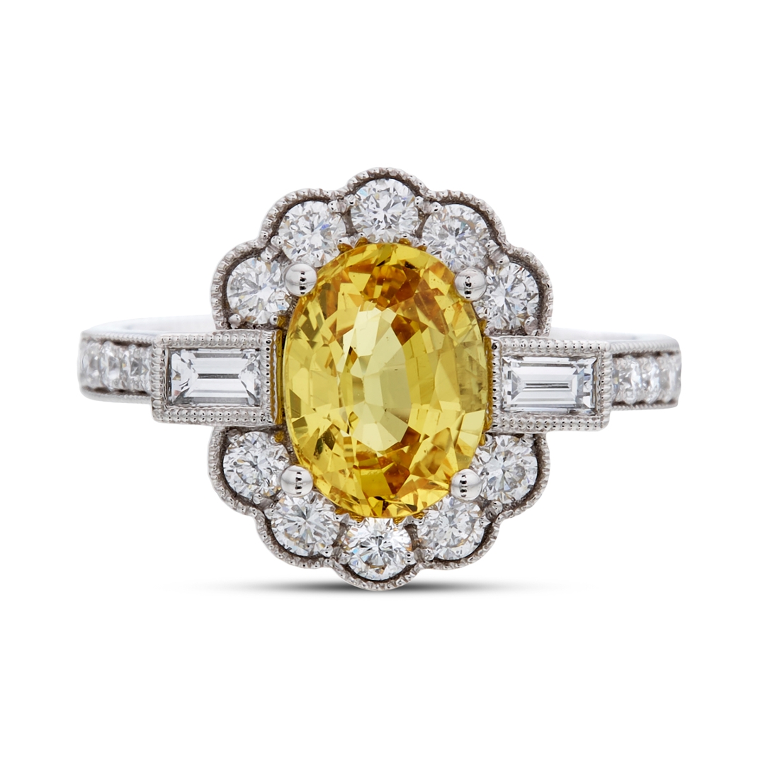 A brand-new, unused certified natural diamond and yellow sapphire cluster ring that brings together vibrant colour, elegant structure and refined brilliance in a beautifully balanced, floral-inspired design. At its centre rests a 2.42ct oval mixed-cut yellow sapphire, displaying a bright, uplifting yellow tone and offering lively flashes of colour that give the ring an immediate sense of warmth and radiance. The oval shape enhances the sapphire’s natural glow, while two baguette-cut diamonds positioned on either side introduce clean, linear light, adding sophistication and a graceful sense of symmetry.