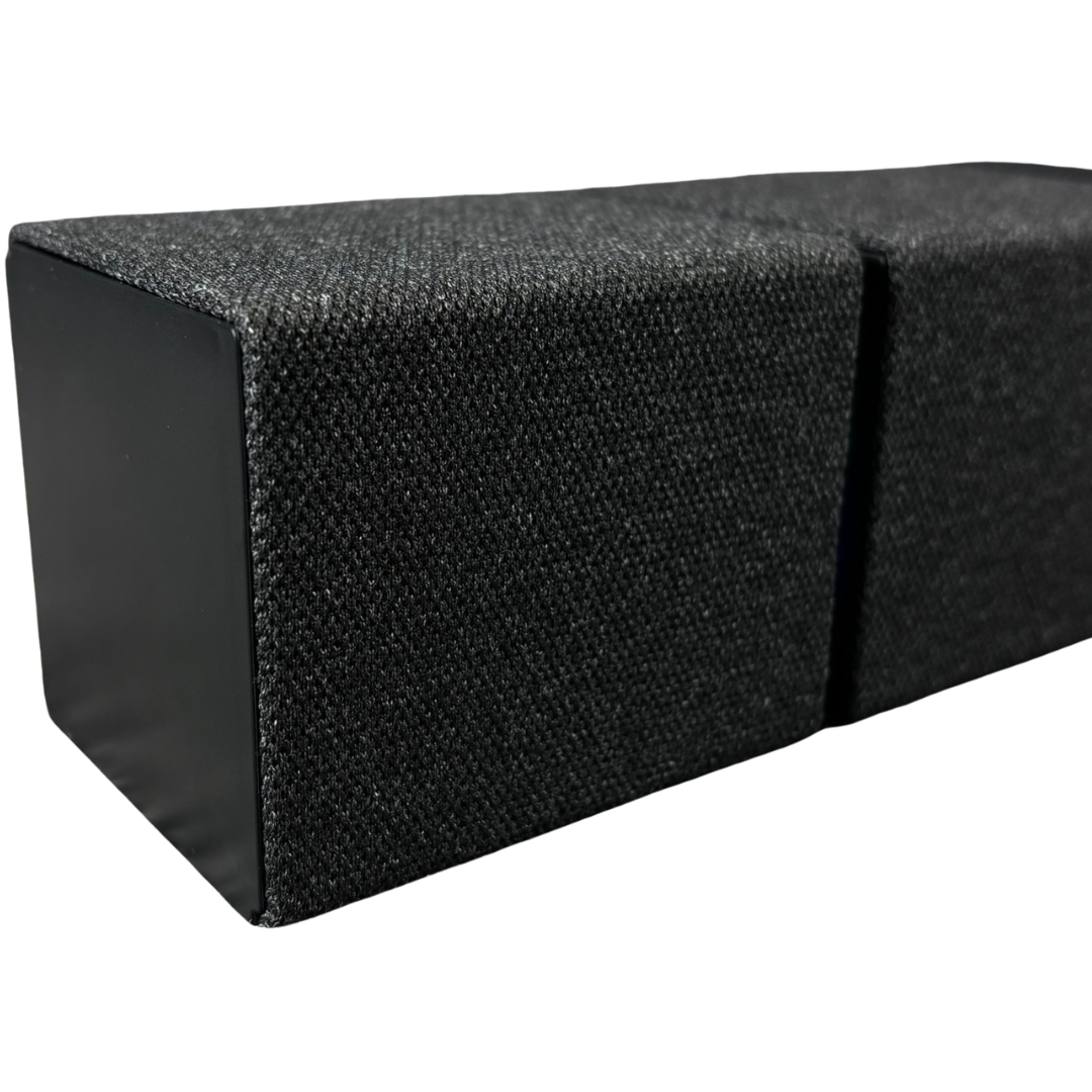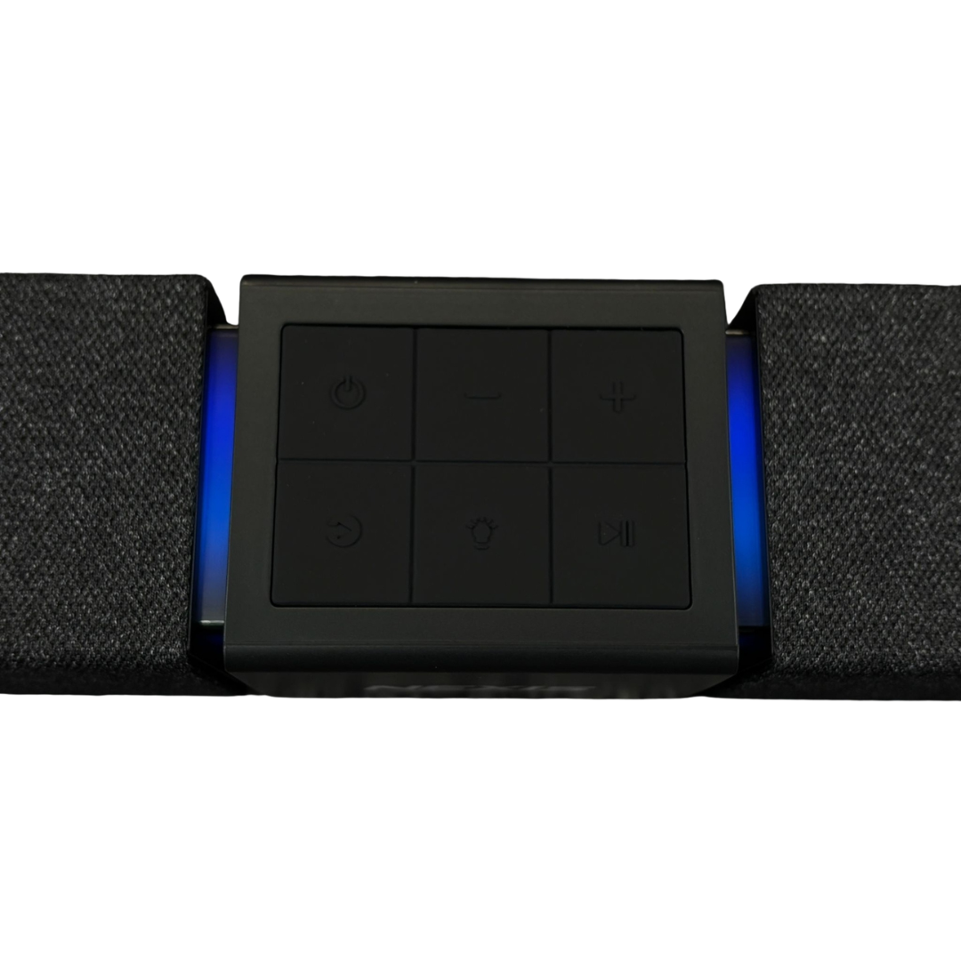 A brand new Nexis portable wireless Bluetooth soundbar in a sleek black finish, designed to deliver an impressive audio upgrade for any desk or entertainment setup. The modern modular design creates a wider sound presence while maintaining a compact footprint, making it ideal for both home and office use. Subtle RGB lighting adds a contemporary touch, while the central control panel ensures simple and intuitive operation.