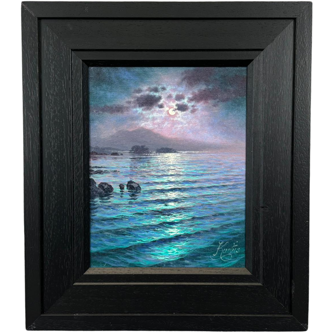 A framed original oil painting by Andrew Grant Kurtis titled 'Moonlight Sparkle Lakeland'. Approx 10" height, 8" width.