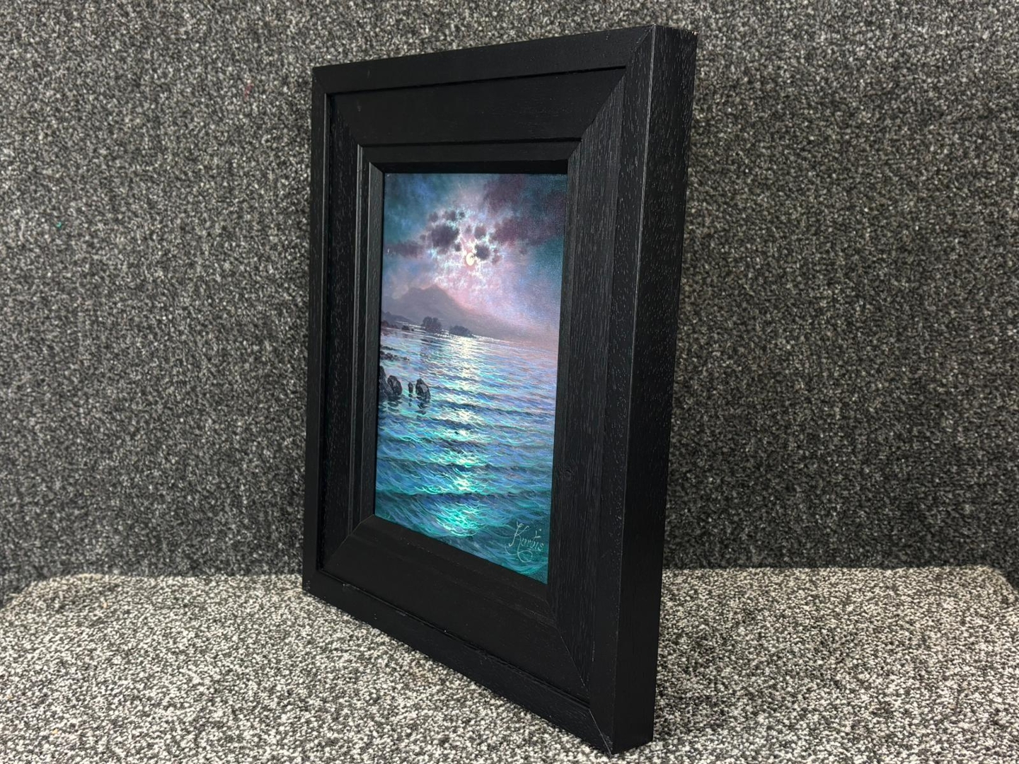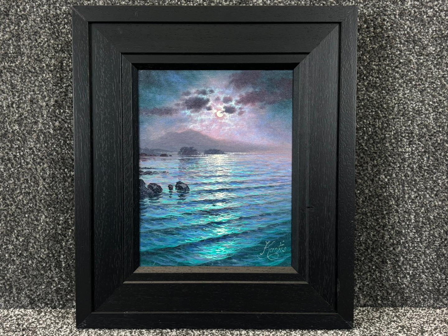 A well-proportioned artwork measuring approximately 10 inches in height and 8 inches in width, presented in a bold, dark frame that enhances the painting’s contrast and depth. A highly decorative and collectible piece, ideal for admirers of atmospheric landscapes and Kurtis’ distinctive style.