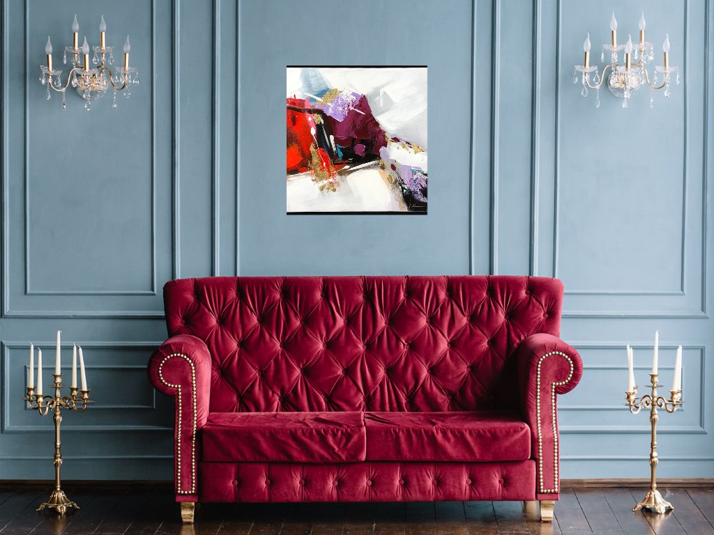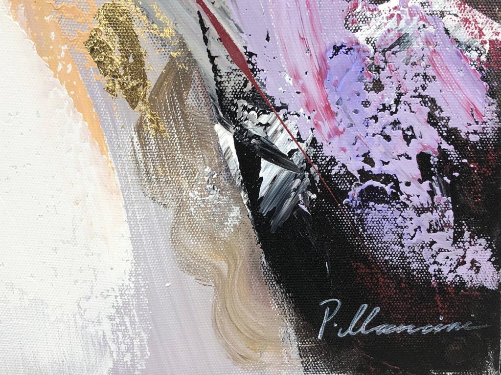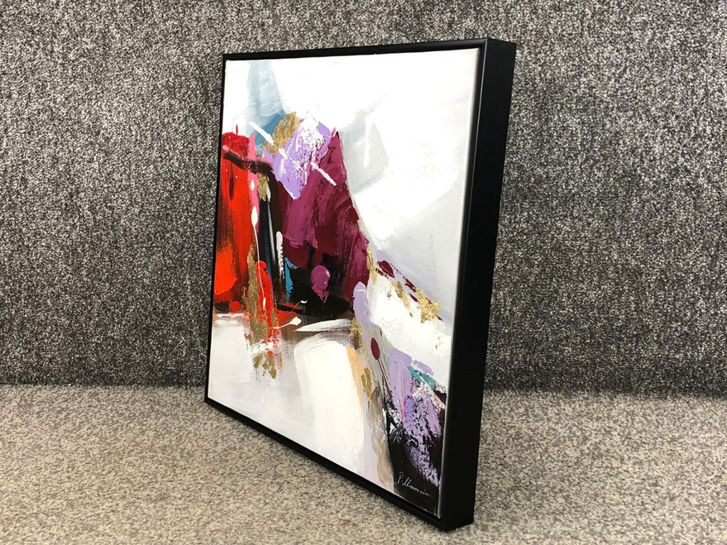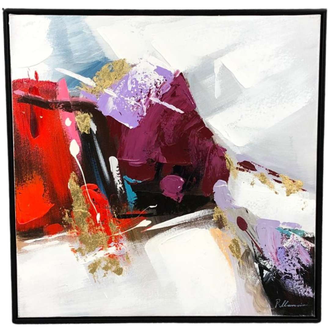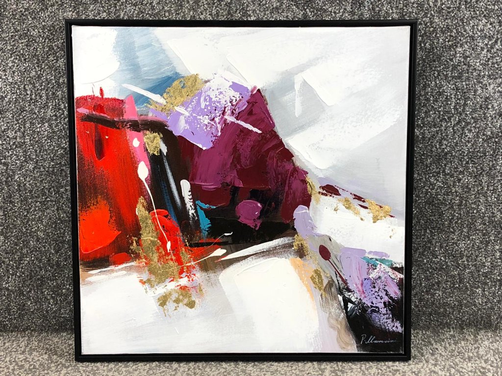 A framed oil painting by artist P. Mancini, titled ‘Abstract Art’, is a vibrant exploration of movement, texture, and emotion. Measuring approximately 20 inches in height and 20 inches in width, the piece commands attention with its bold composition and dynamic use of colour. Rich tones of red, purple, and gold interplay against soft whites and muted greys, creating a sense of contrast and energy that draws the viewer in.