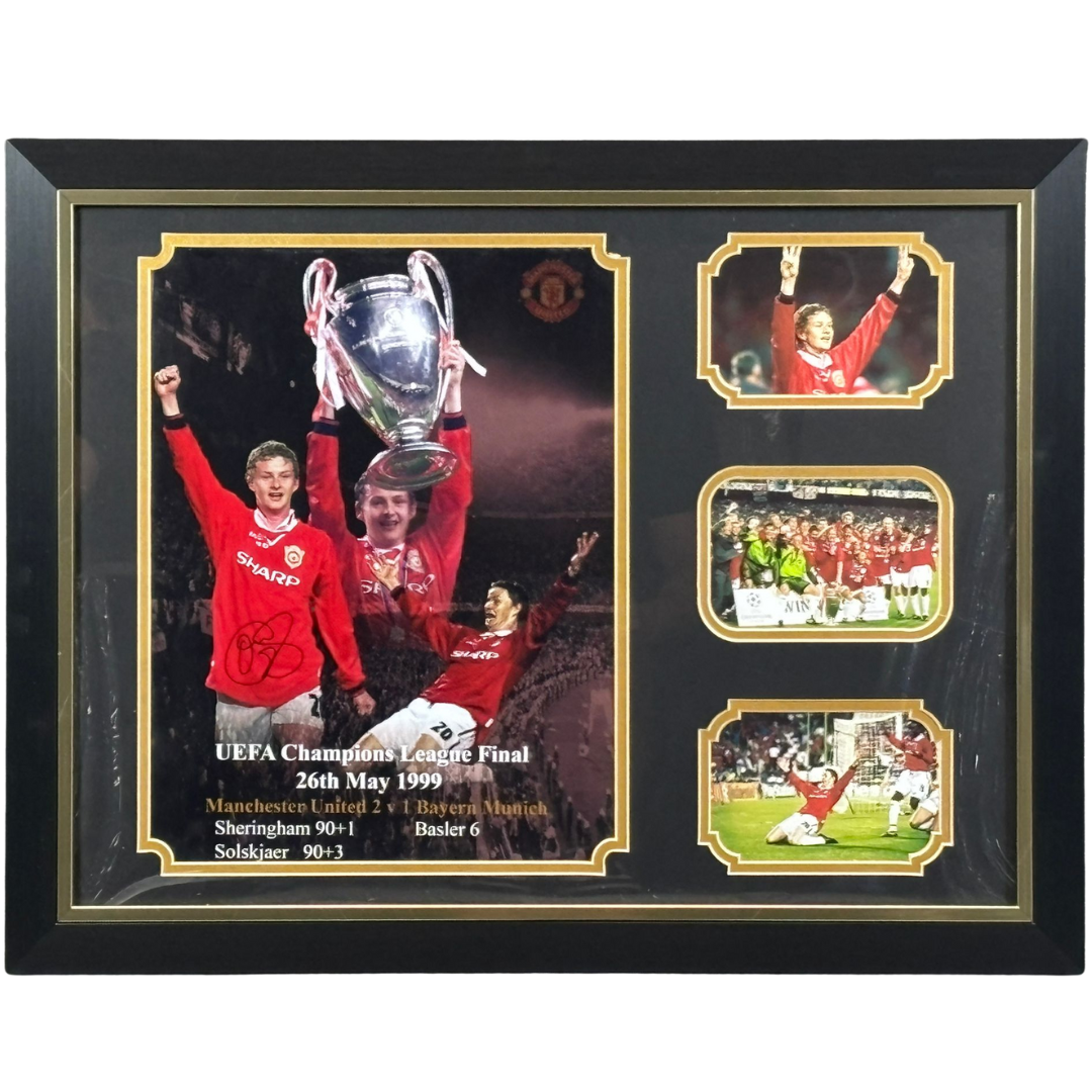 A signed and authenticated Ole Gunnar Solskjaer Manchester United picture montage, beautifully presented in a premium display frame. A tribute to the man whose legendary last-minute goal secured the 1999 UEFA Champions League title, this stunning piece is a must-have for any true Red Devils supporter.