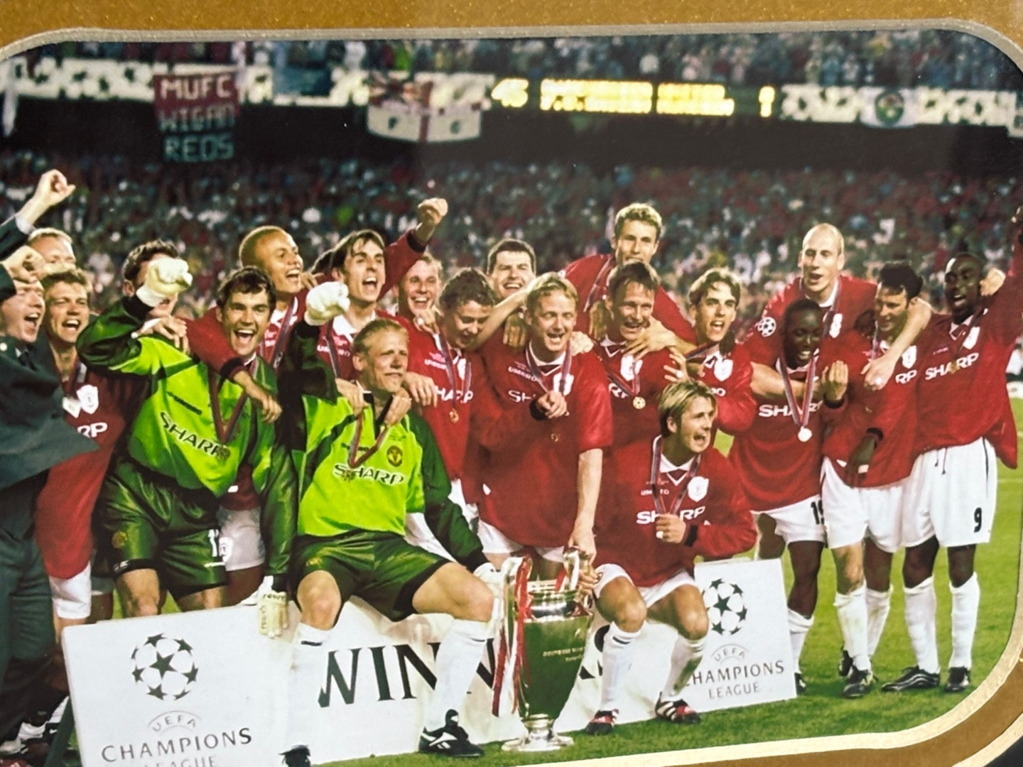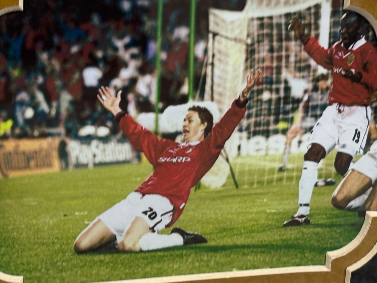 Measuring approximately 53cm in height and 68cm in width, the central image captures Solskjaer in celebration, lifting the European Cup, with his signature displayed. Surrounding this are additional photos from that unforgettable night in Barcelona—including the dramatic winning goal, jubilant squad scenes, and Solskjaer’s arms-raised triumph. The caption details the final scoreline and timing of the goals, marking a pinnacle moment in United’s treble-winning season.
