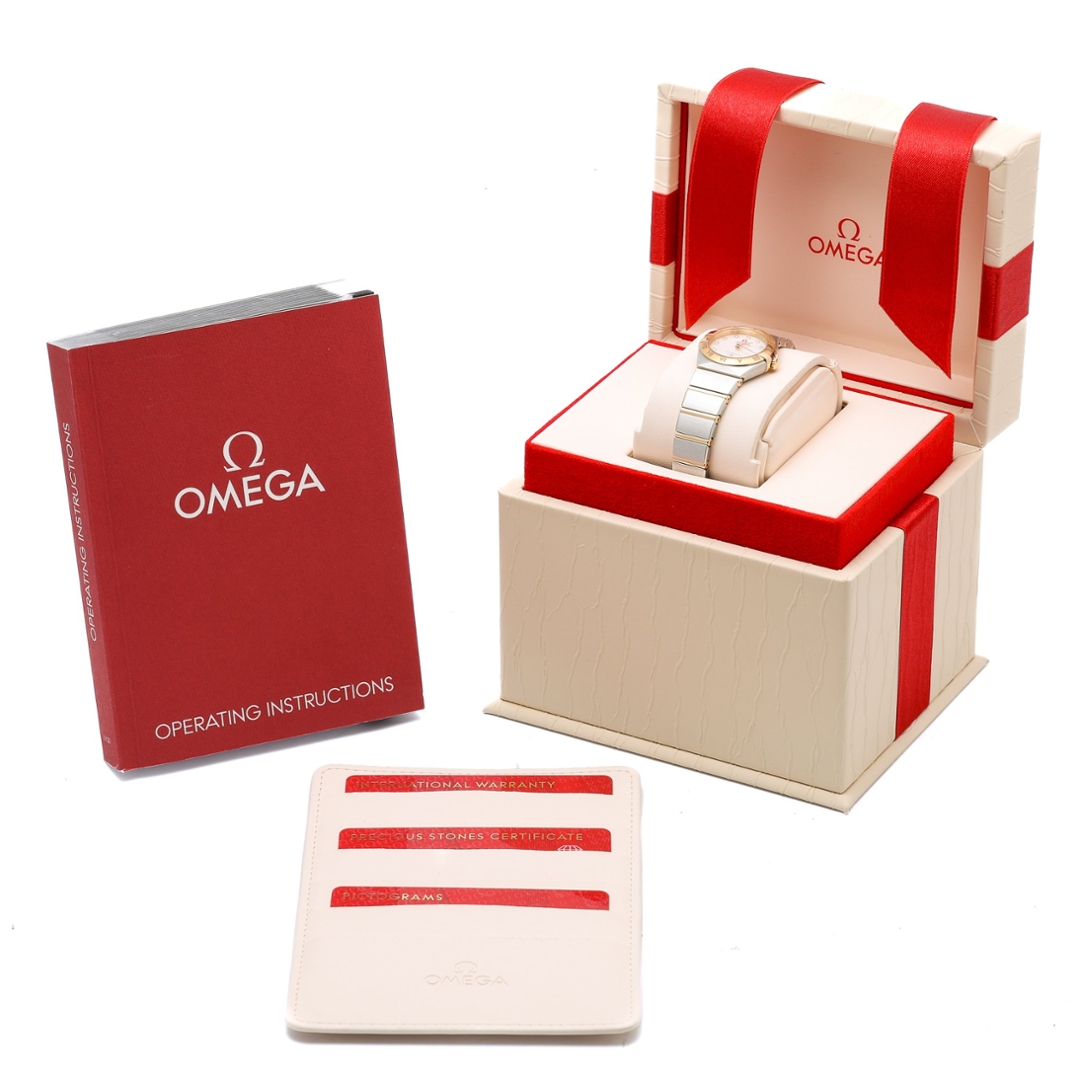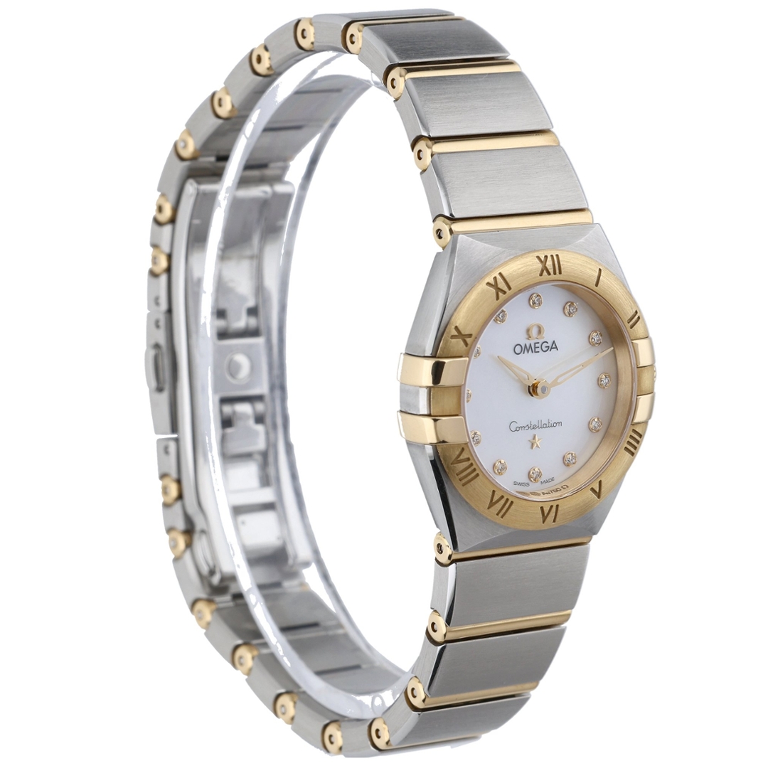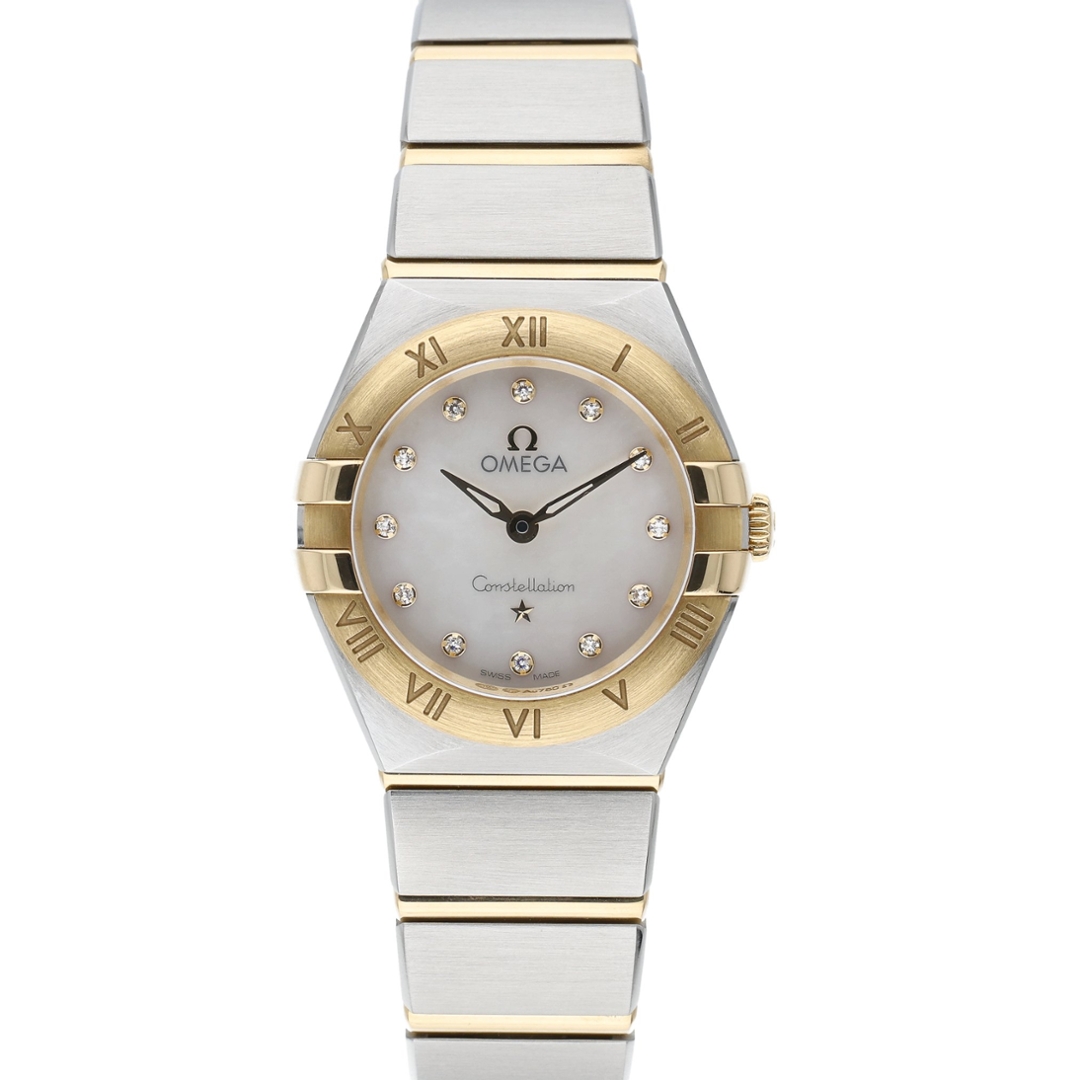 An Omega Constellation, crafted in stainless steel and 18ct yellow gold, presented on a white mother-of-pearl dial set with diamond hour markers. The signature Roman numeral bezel and integrated bracelet design ensure timeless elegance, making this a classic Constellation piece.
