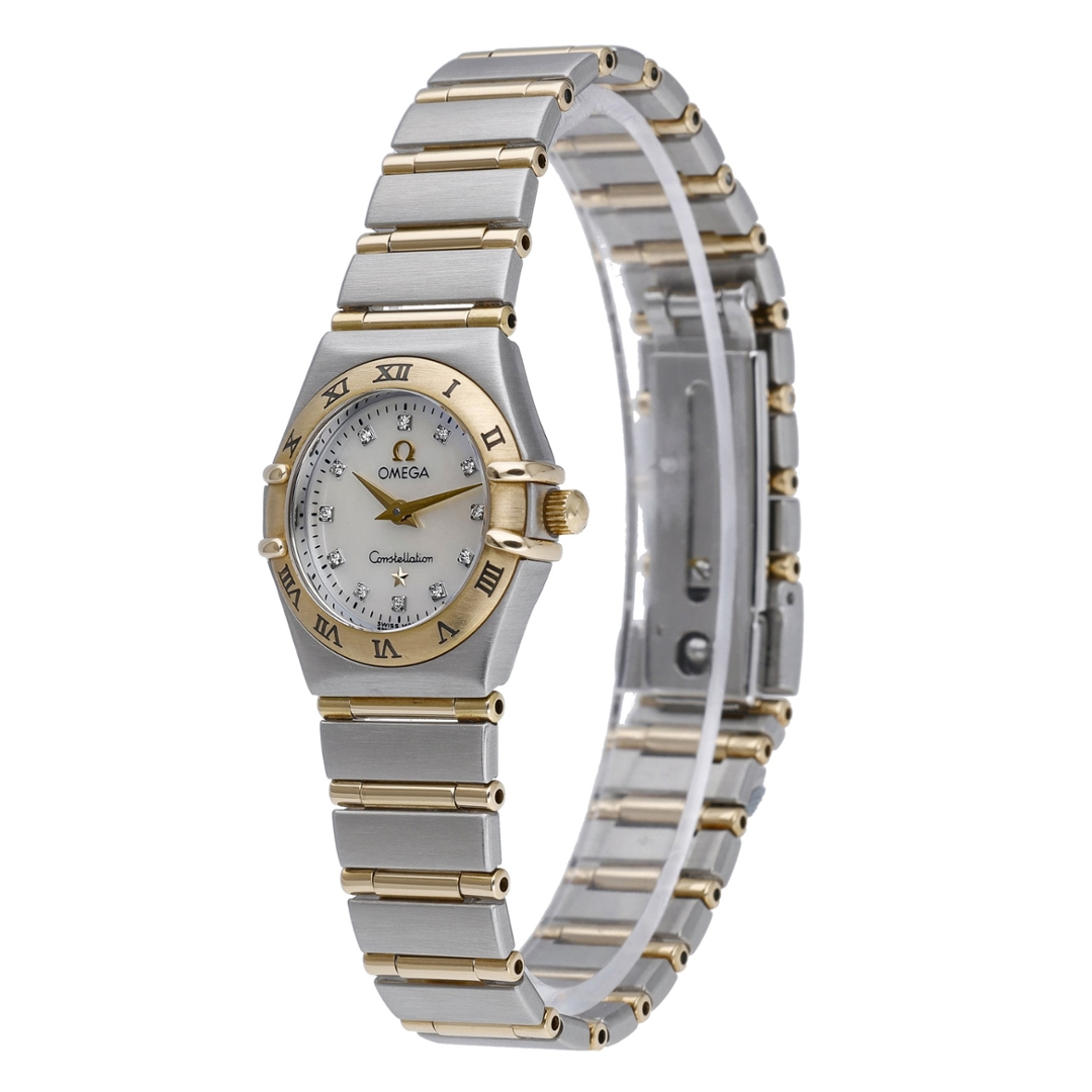 An Omega Constellation Watch in bi-metal stainless steel and 18ct yellow gold, presented in immaculate condition, showcasing a refined and elegant design within Omega’s iconic Constellation line. The 22mm case is complemented by the signature integrated bracelet, combining brushed steel with gold accents for a balanced and sophisticated wrist presence. The mother-of-pearl dial has been afterset with diamond hour markers, offering a bright, iridescent finish enhanced by added brilliance, while the classic Roman numeral bezel frames the dial beautifully.
