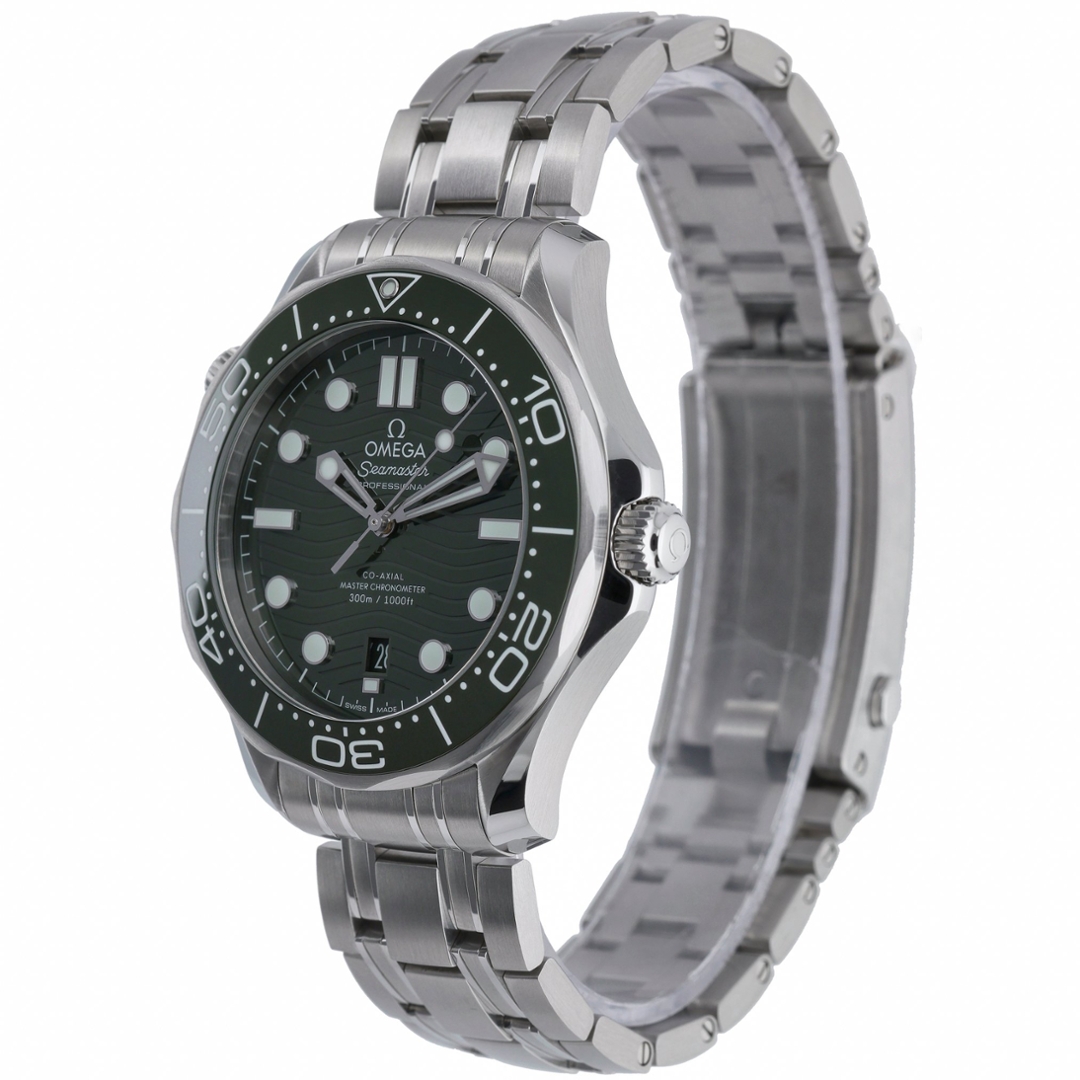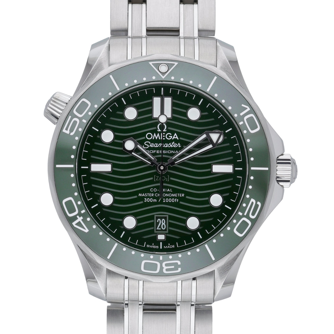 An Omega Seamaster Diver 300M is an immaculate example of one of the most distinctive modern colourways in the Seamaster line, presented in stainless steel with a rich green ceramic bezel and matching wave-engraved green dial. The combination of vibrant tone and crisp detailing gives the watch a contemporary character while remaining faithful to the heritage of the Diver 300M series, making it an effortlessly wearable piece for both daily use and more formal settings.