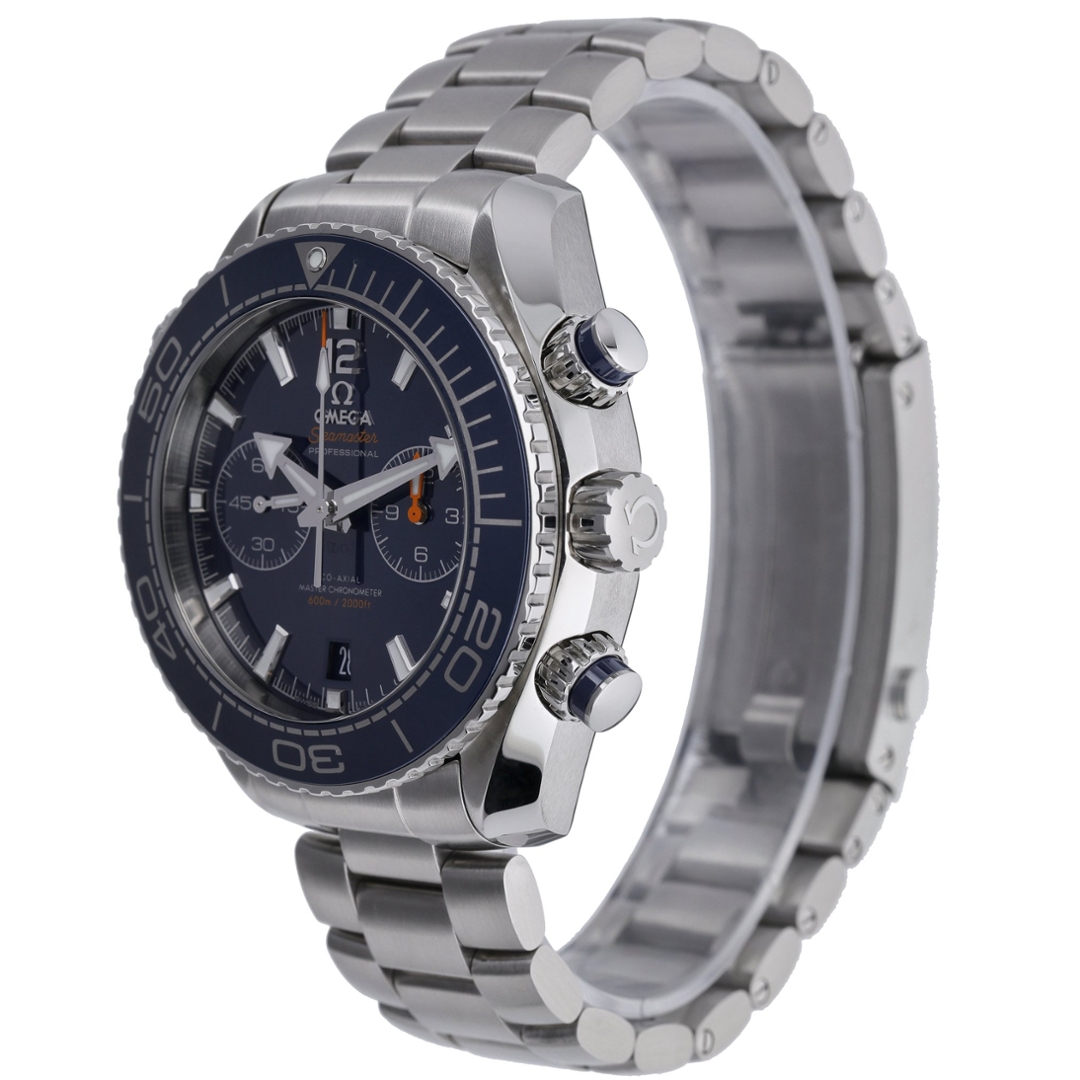 An Omega Seamaster Planet Ocean Chronograph watch crafted in stainless steel, featuring a striking blue ceramic bezel and matching blue dial that embody the spirit of Omega’s maritime legacy. Model number 215.30.46.51.03.001, this 2025 example is powered by the exceptional Omega Co-Axial Master Chronometer Calibre 9900 movement, officially certified by METAS for precision, magnetic resistance, and reliability. The 45.5mm case offers a commanding wrist presence while maintaining balanced proportions, making it both a professional diving instrument and a luxury sports chronograph.