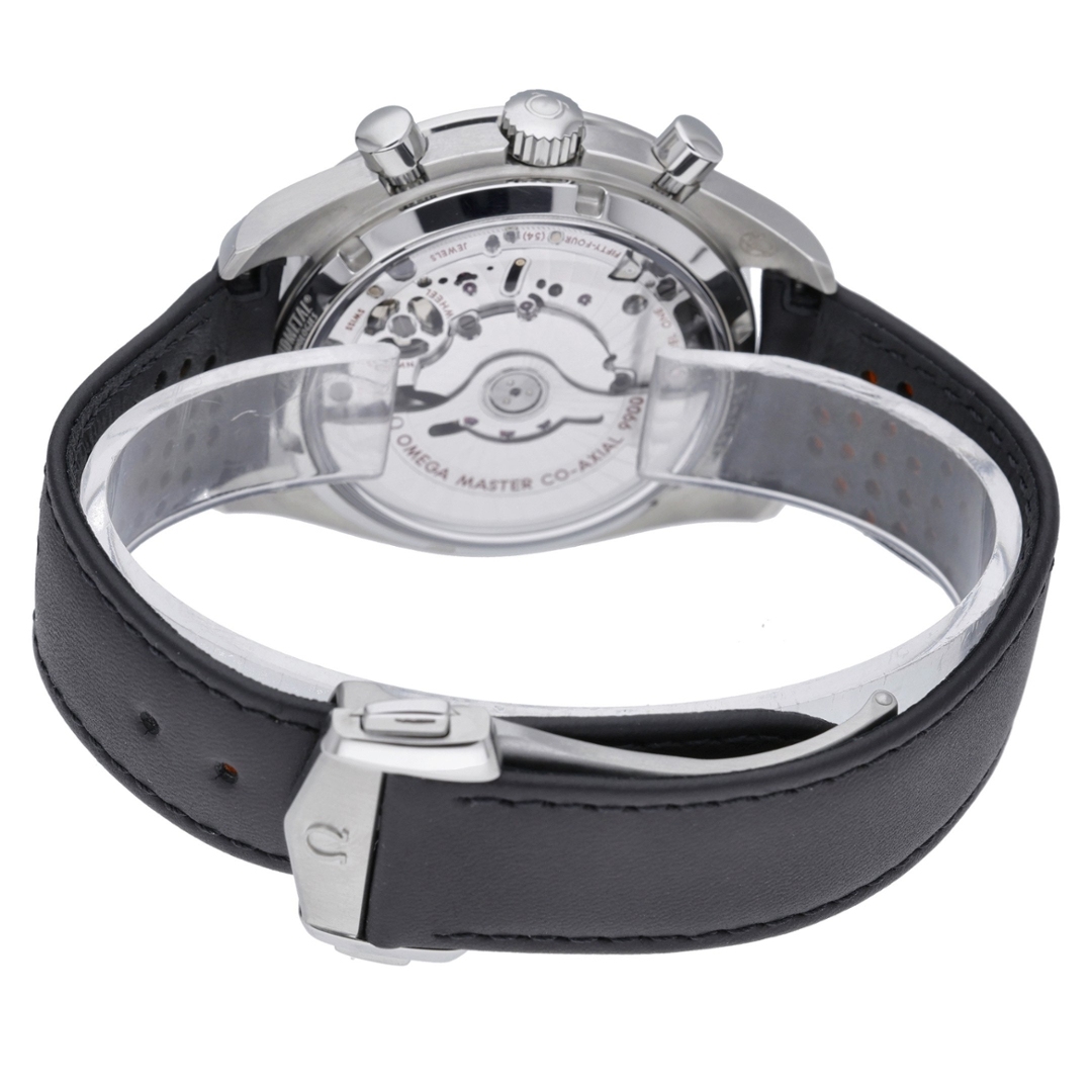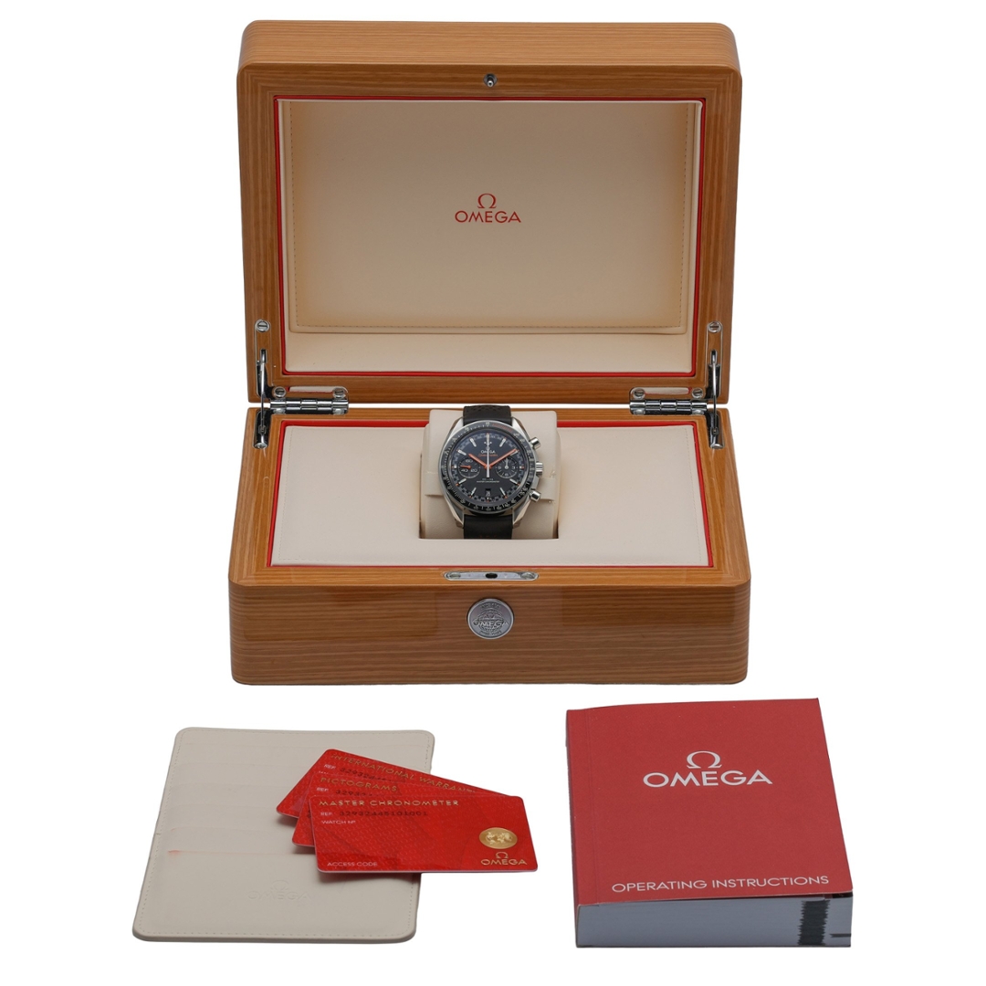 The 44.2mm case gives this Speedmaster a commanding wrist presence, while the black ceramic tachymeter bezel with orange “Tachymètre” text adds a striking motorsport-inspired touch. The matte black dial features rhodium-plated hour markers, two sub-dials for chronograph and running seconds, and a discreet date display at 6 o’clock. The orange chronograph hands and minute track offer both functionality and dynamic style, reflecting the collection’s racing heritage.