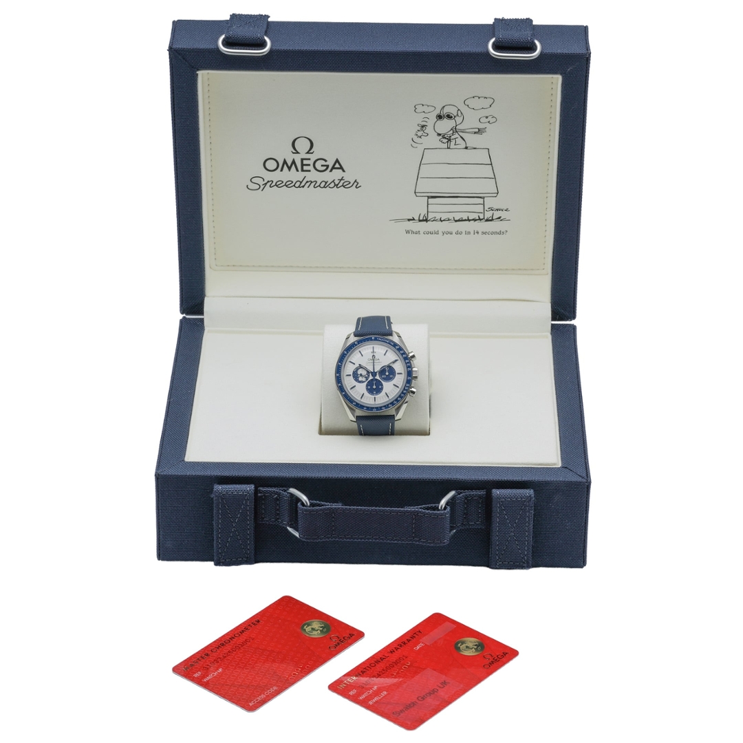 An Omega Speedmaster Anniversary Series (Snoopy) Watch, Blue Leather Strap with a Stainless Steel Case & Clasp and a Blue Bezel on a White Dial