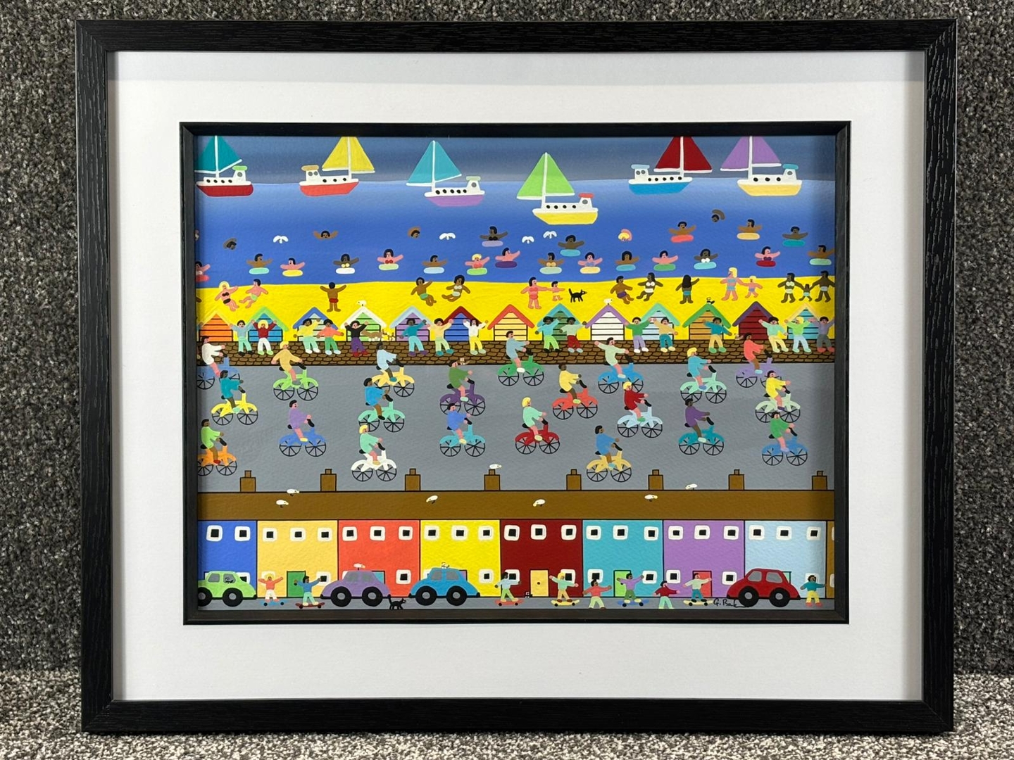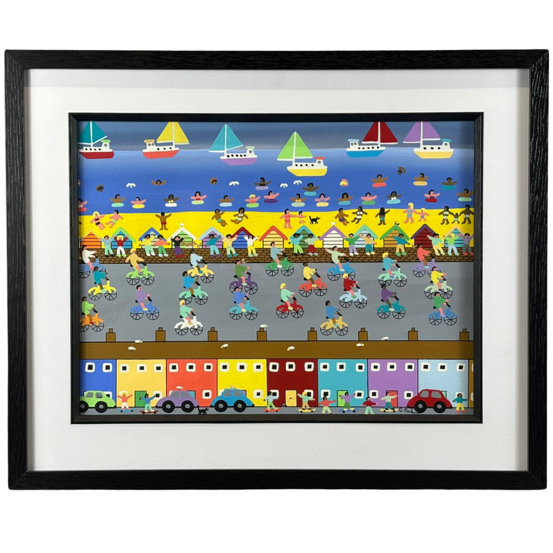 An original oil painting by celebrated British artist Gordon Barker, Fun Bike Race is a joyful explosion of movement, colour, and coastal charm. Measuring approximately 43cm in height and 53cm in width, including its stylish black frame, this dynamic piece showcases Barker’s signature naïve style and exuberant storytelling.