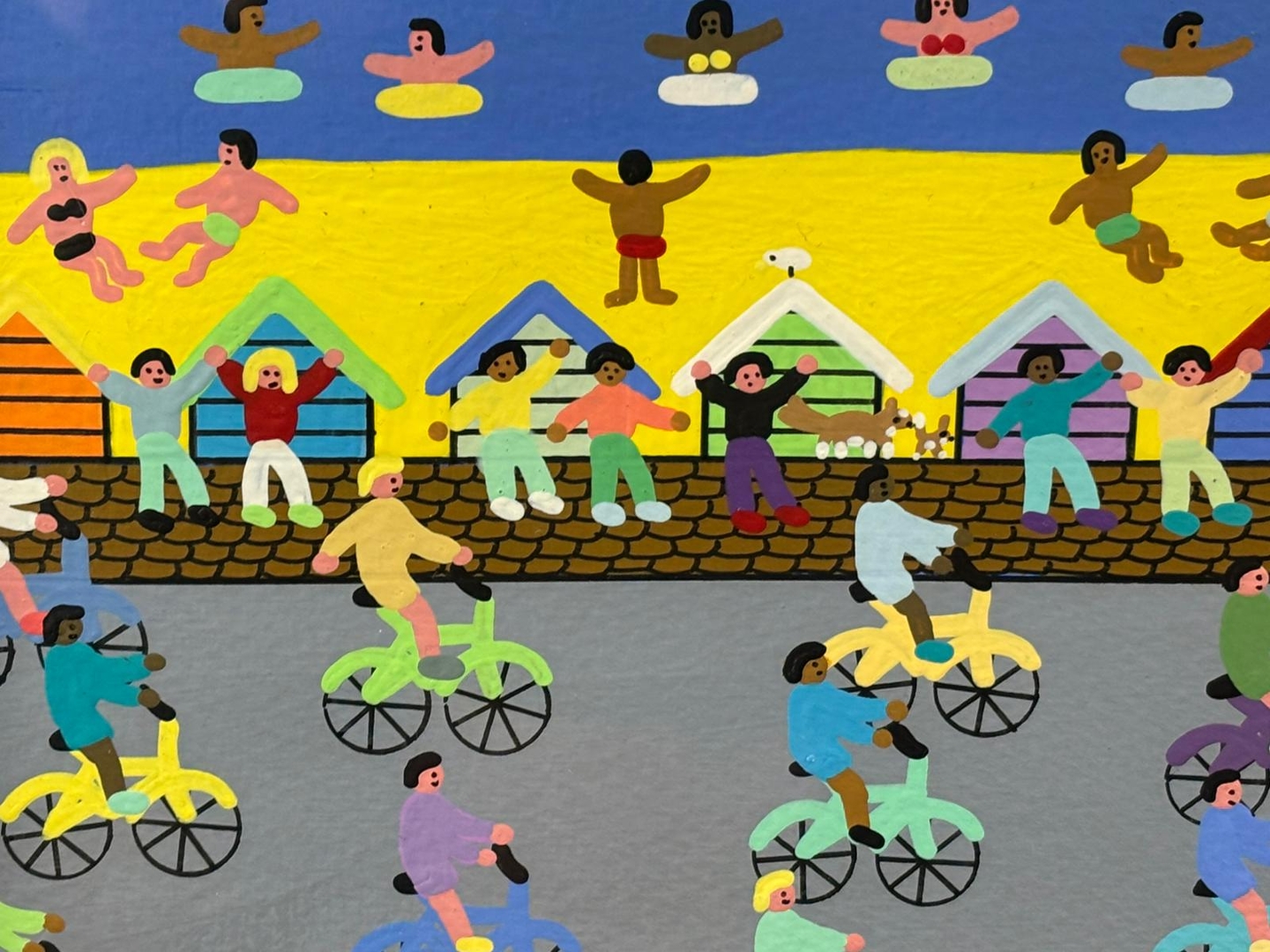 Set against a lively seaside backdrop, the scene unfolds in delightful layers. Sailboats glide across a deep blue sea while swimmers bob in colourful rings. The sandy beach is alive with beach huts and cheerful families enjoying the sunshine. Just below, a bustling promenade hosts a thrilling bike race, with a cascade of riders pedalling their way through a flurry of excitement and friendly competition. Further down, rows of bright terraced houses frame the lower edge, adding a final burst of charm and community spirit.