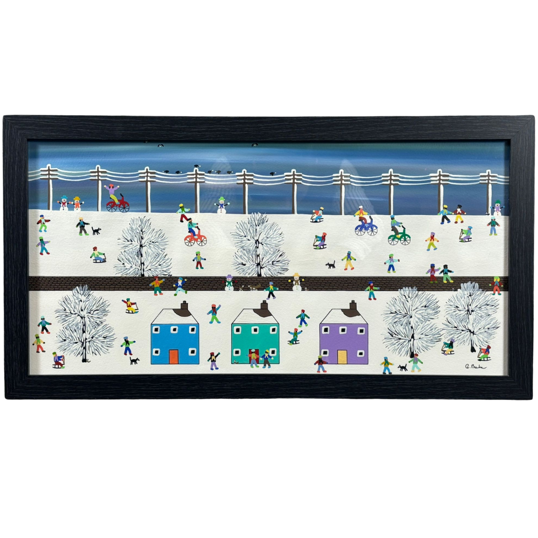 A framed original oil painting by the artist Gordon Barker titled 'On a Snowy Day Like This'. Approx 35cm height, 65cm width.