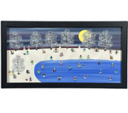 The painting depicts a stylised snowy landscape filled with