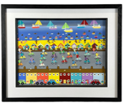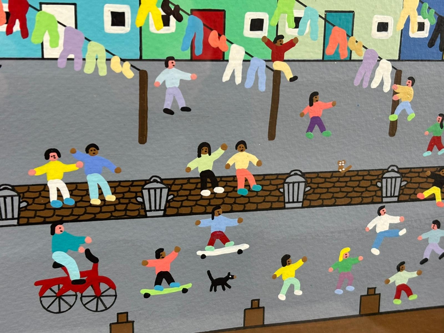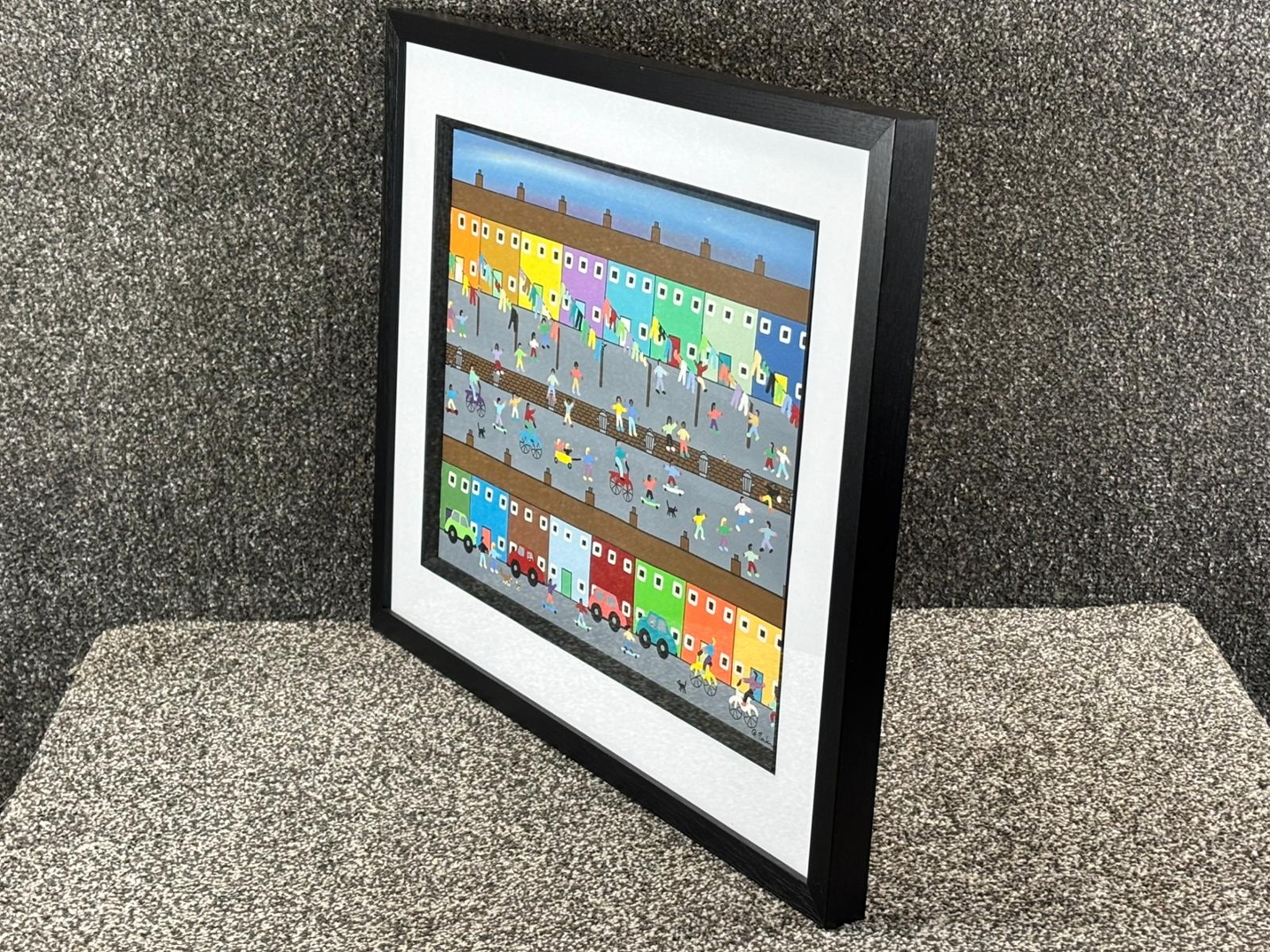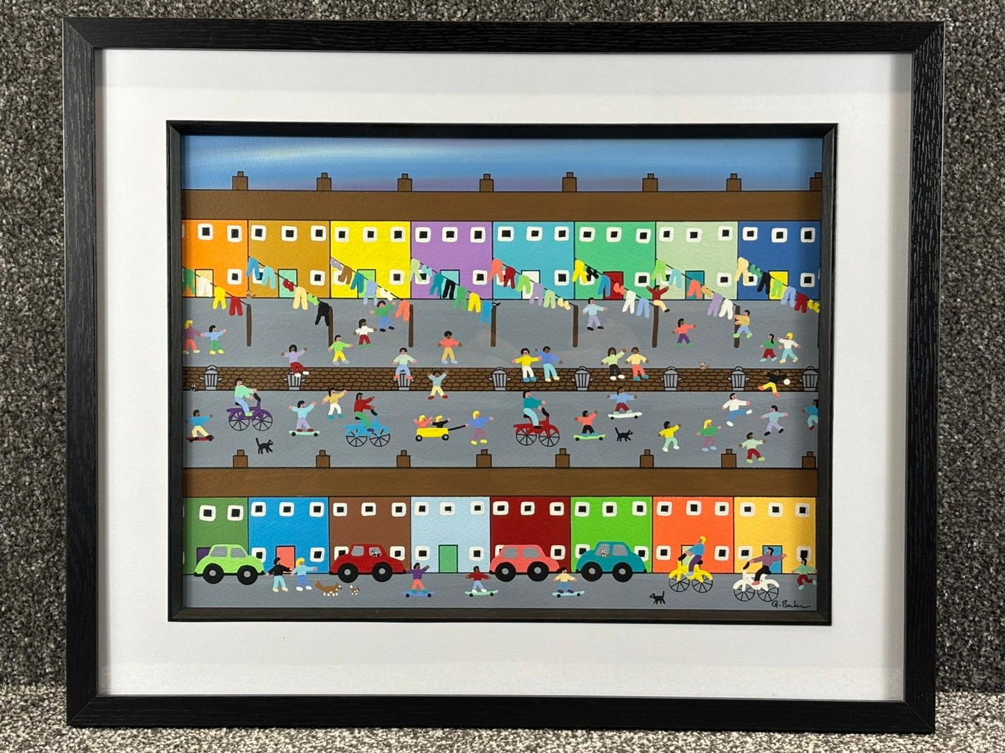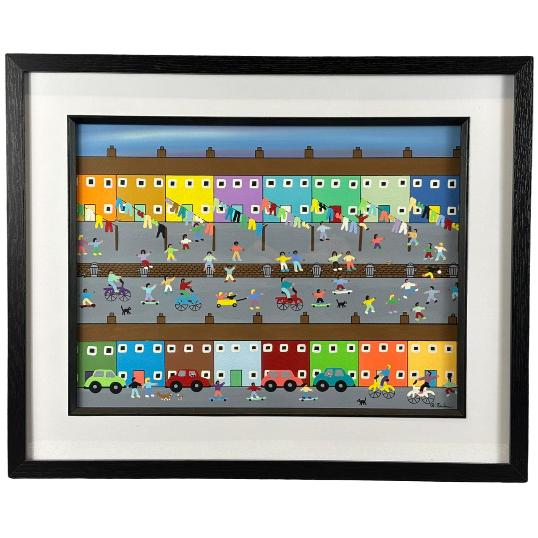 An original oil painting by popular British artist Gordon Barker, Out In The Streets is a vibrant celebration of everyday community life, bursting with colour, energy, and charm. Measuring approximately 43cm in height and 53cm in width, including its black frame, this captivating piece captures Barker’s distinctive naïve style with delightful attention to detail.