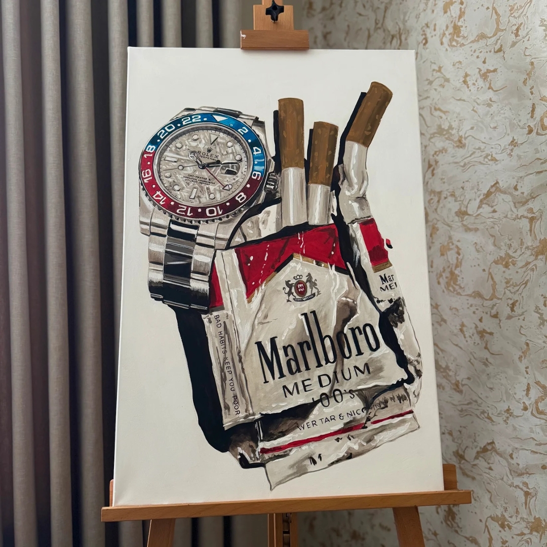 An original oil painting by the artist Liam Jacobi of a Rolex GMT Watch & a pack of Marlboro Cigarettes.