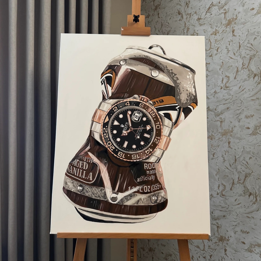 A striking original oil painting by Liam Jacobi, presenting a bold fusion of luxury horology and contemporary lifestyle imagery. The composition centres on a Rolex GMT watch, rendered with impressive precision, wrapped around a crushed root beer can. The rich tones and reflective detailing capture both the weight of the timepiece and the textured realism of the aluminium can, creating an immediate visual impact.