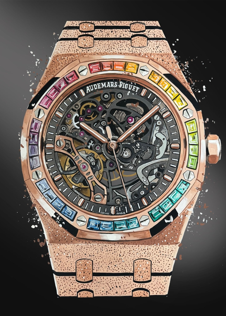 Original Painting by the Artist Liam Jacobi an Audemars Piguet Skeleton Rose Frosted Rainbow Watch.