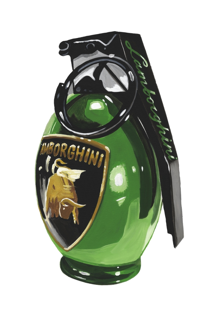 An original painting by the artist Liam Jacobi of a Green Lamborghini Hand Grenade.