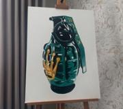 A striking original painting by Liam Jacobi, presenting a bold and contemporary interpretation of a green Lamborghini hand grenade. The composition is clean and impactful, set against a soft neutral backdrop that allows the vivid tones and high-gloss detailing of the subject to stand out with exceptional clarity.