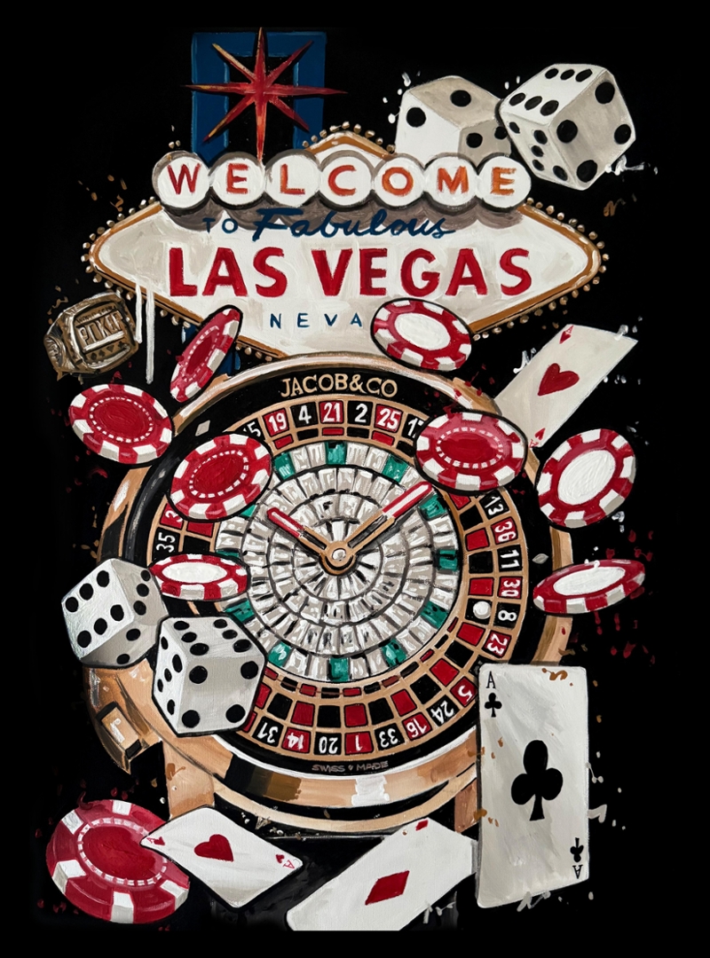 A bold and visually dynamic original painting by Liam Jacobi, inspired by the unmistakable energy of Las Vegas and the intricate design language of Jacob & Co. The composition centres around a highly detailed casino-style watch, surrounded by iconic elements including poker chips, dice, and playing cards, all set beneath the instantly recognisable “Welcome to Fabulous Las Vegas” sign.