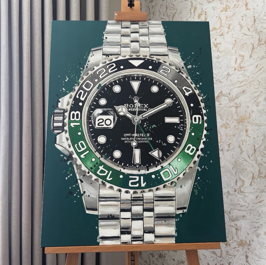 An original painting by the artist Liam Jacobi of a Rolex GMT Sprite Watch.