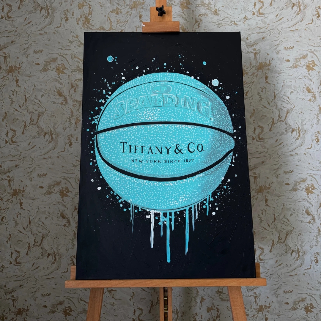 A striking original painting by Liam Jacobi, featuring a Tiffany & Co. inspired basketball set against a deep, dark backdrop. The iconic Tiffany blue sphere is rendered with bold texture and layered detailing, while the signature branding sits cleanly across the centre, creating an immediate visual impact. Subtle paint drips and splatter accents introduce movement and energy, blending luxury symbolism with a contemporary street-art influence.