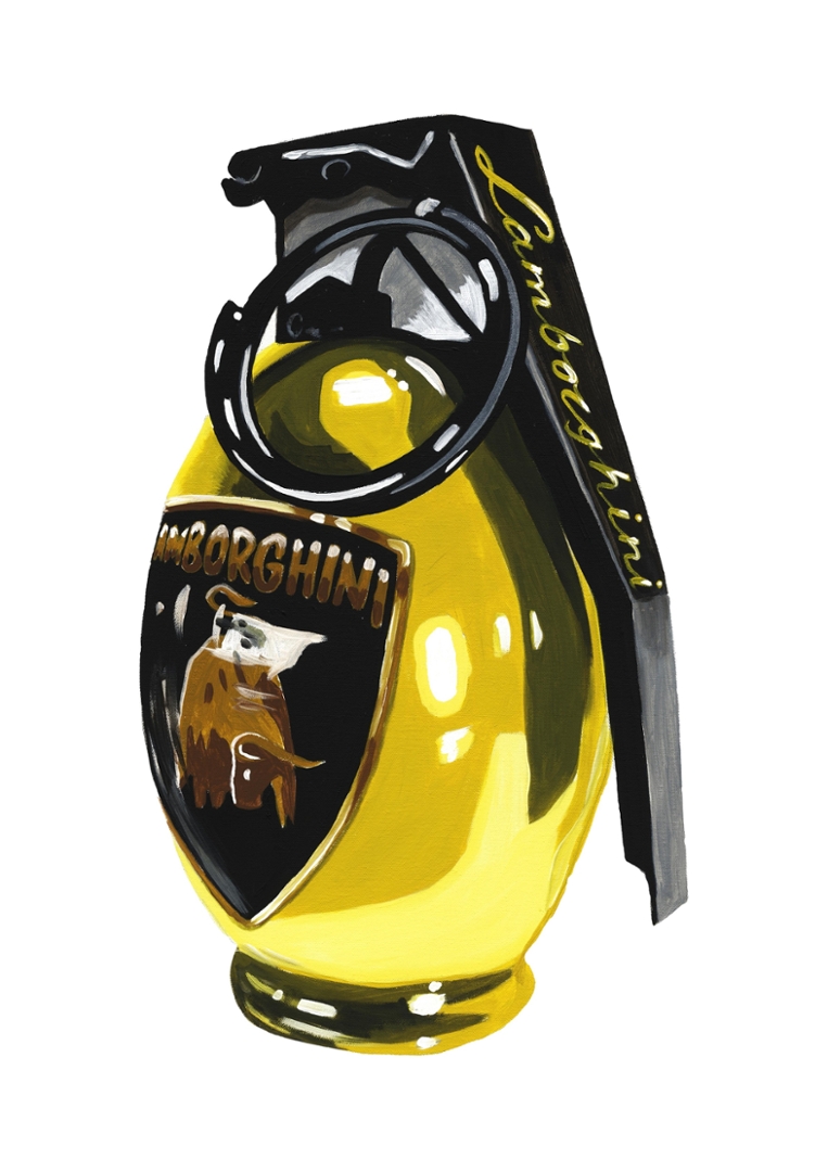 An original painting by the artist Liam Jacobi of a Yellow Lamborghini Hand Grenade.