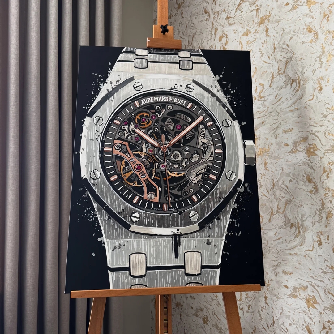 - > Original Painting by the Artist Liam Jacobi of an Audemars Piguet Steel Skeleton Watch.