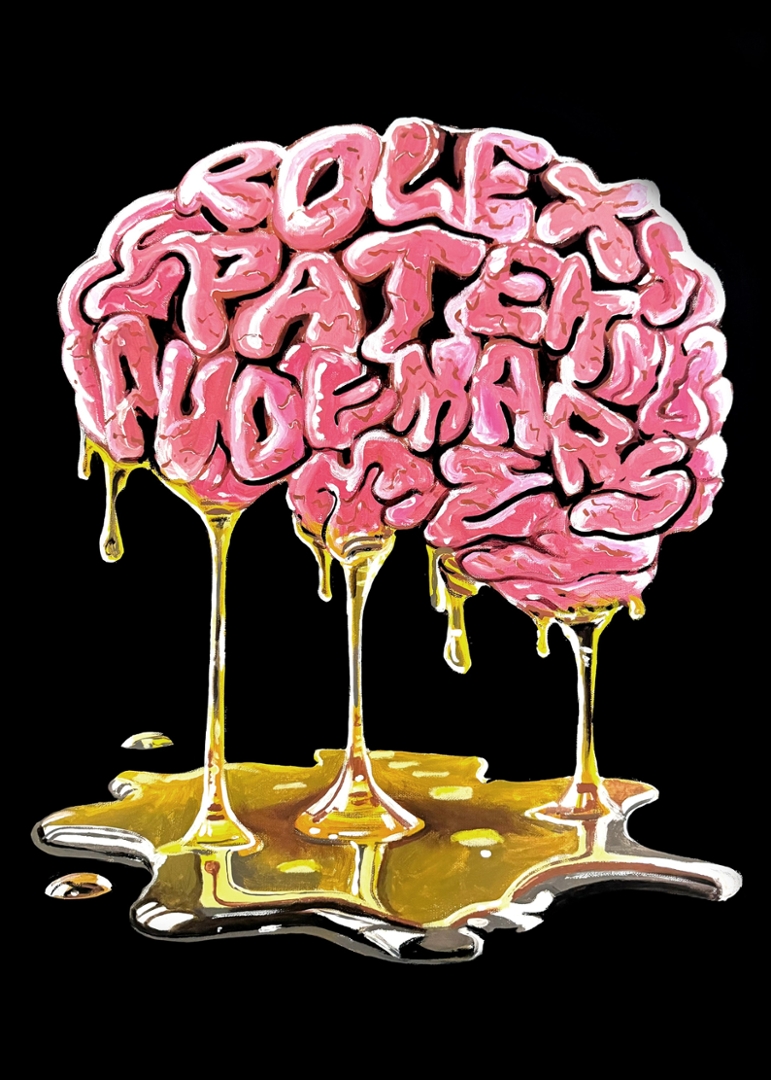 A striking original painting by Liam Jacobi titled Watches On The Mind, presented in a bold and contemporary style that immediately captures attention. The composition features a stylised brain formed from fluid, sculptural lettering, with the words seamlessly integrated into its shape, creating a powerful visual link between obsession, luxury, and identity.