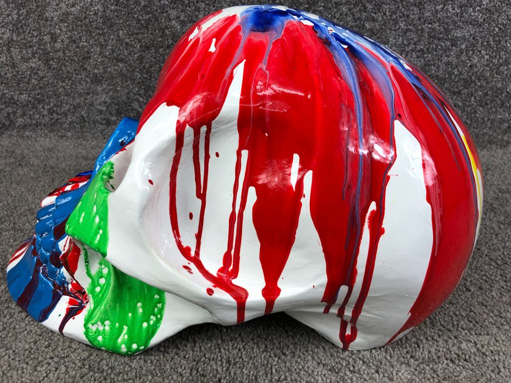 - > Paint Splashed Sculpture of a Skull