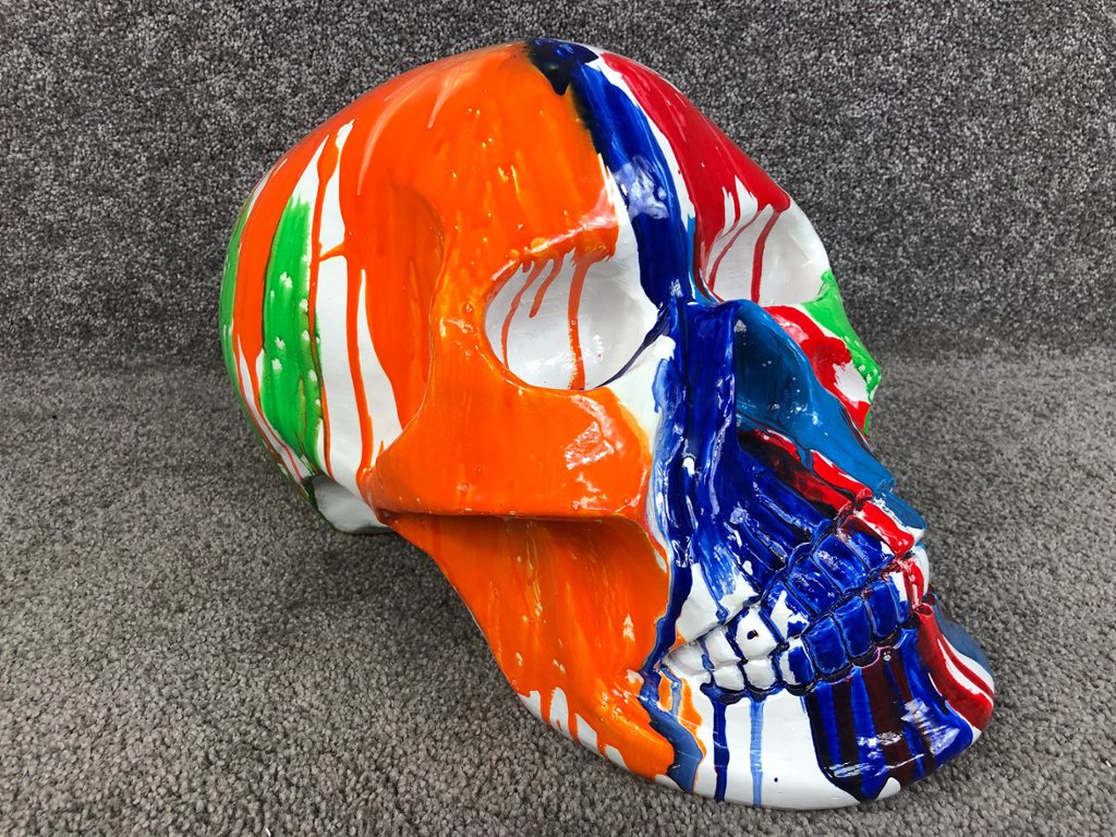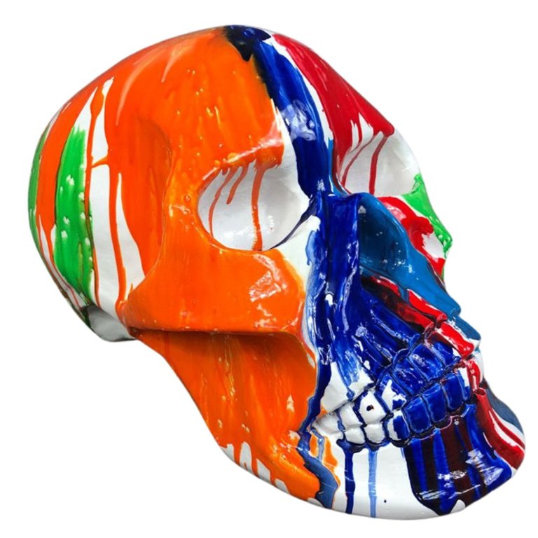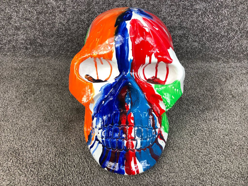 Crafted with meticulous attention to detail, the sculpture portrays a stylised skull adorned with vibrant paint splashes in an array of colours. The bold and expressive brushstrokes add a sense of movement and vitality to the piece, infusing it with a modern and avant-garde aesthetic.