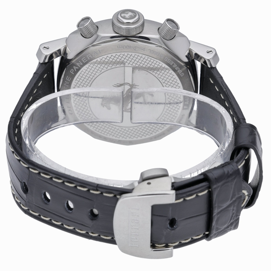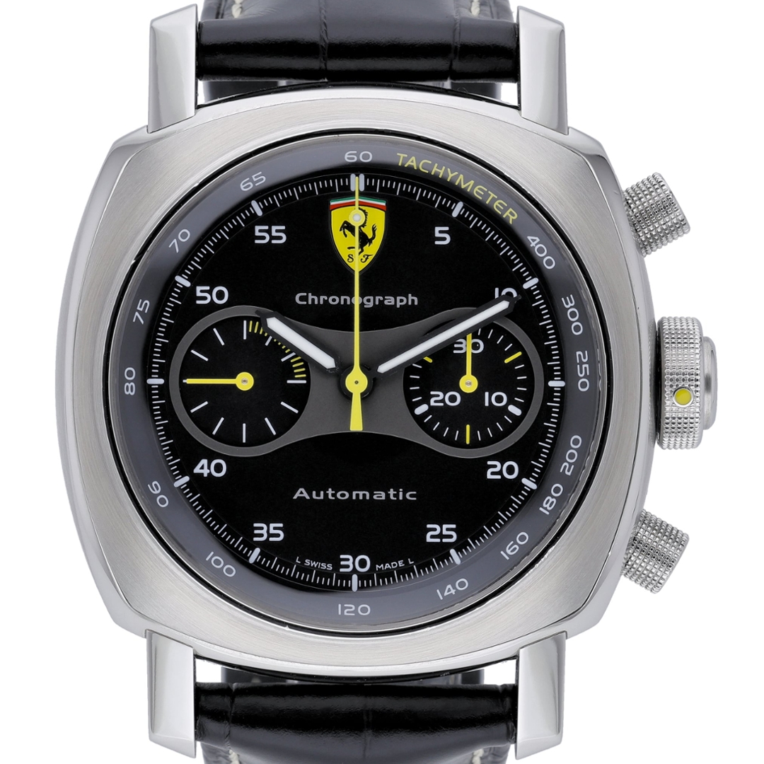 This Panerai Ferrari chronograph reference FE00008 features a bold 45mm stainless steel case, paired with a black leather strap and matching stainless steel clasp. The black dial is framed by a tachymeter bezel and displays the Ferrari shield at twelve o’clock, with contrasting sub-dials and yellow chronograph accents providing strong legibility. Large pushers and a prominent crown reinforce the watch’s motorsport-inspired design language.