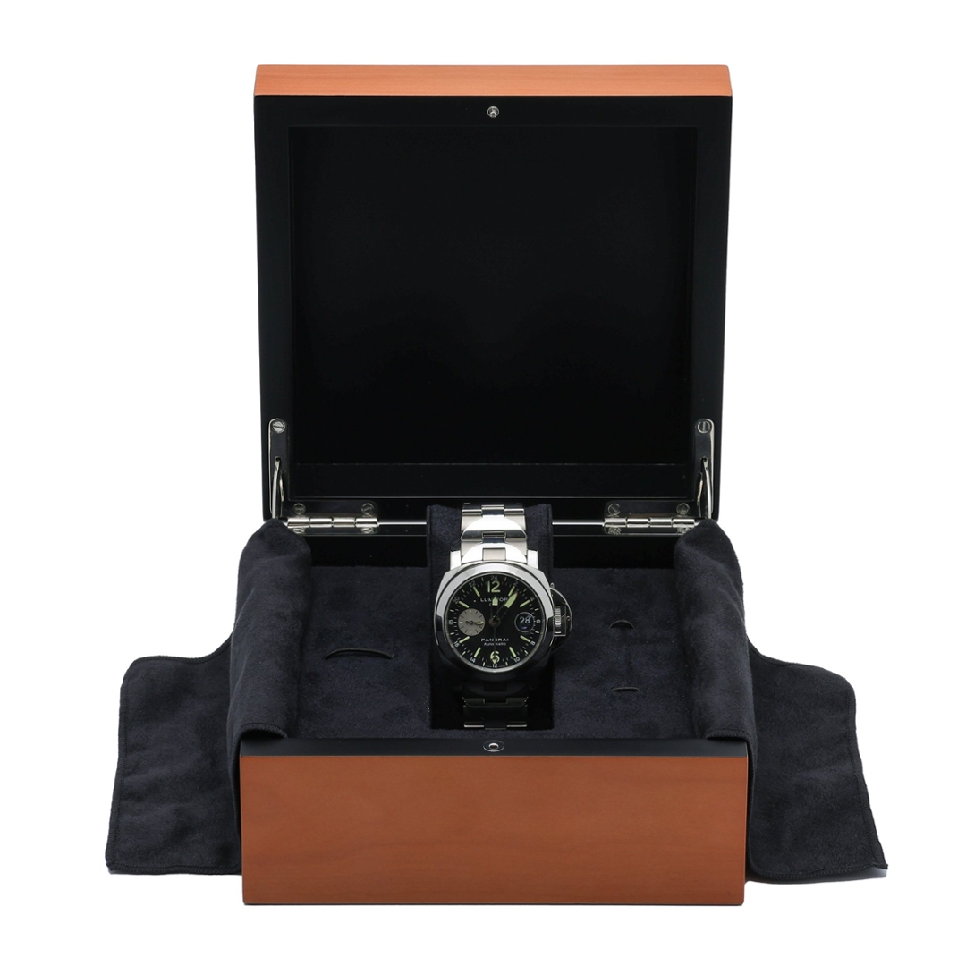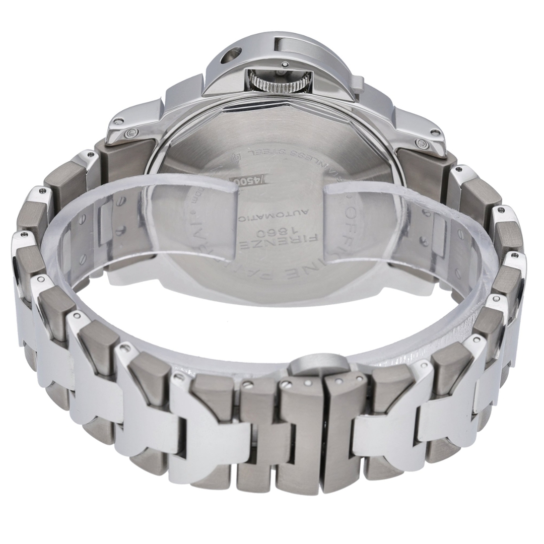 Powered by the Panerai OP VIII automatic movement, this model offers exceptional precision and reliability, with a GMT complication that allows tracking of a second time zone — an essential feature for the frequent traveller. The transparent sapphire case back reveals the intricate movement within, showcasing the meticulous craftsmanship behind every Panerai creation. The stainless steel bracelet enhances the watch’s commanding yet versatile presence, suitable for both professional and casual settings.