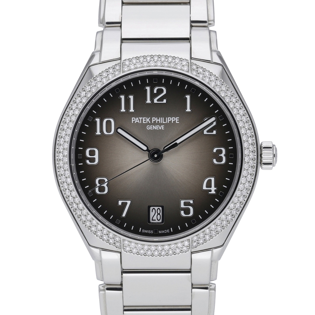 A Patek Philippe Twenty~4 Automatic watch crafted in stainless steel, featuring a refined sunburst grey dial surrounded by a diamond-set bezel that radiates understated luxury. Model number 7300/1200A-010, this 2022 example embodies Patek Philippe’s mastery of elegant design and technical innovation. Powered by the in-house Calibre 324 S C automatic movement, it offers impeccable precision and a beautifully finished rotor visible through the sapphire crystal caseback.