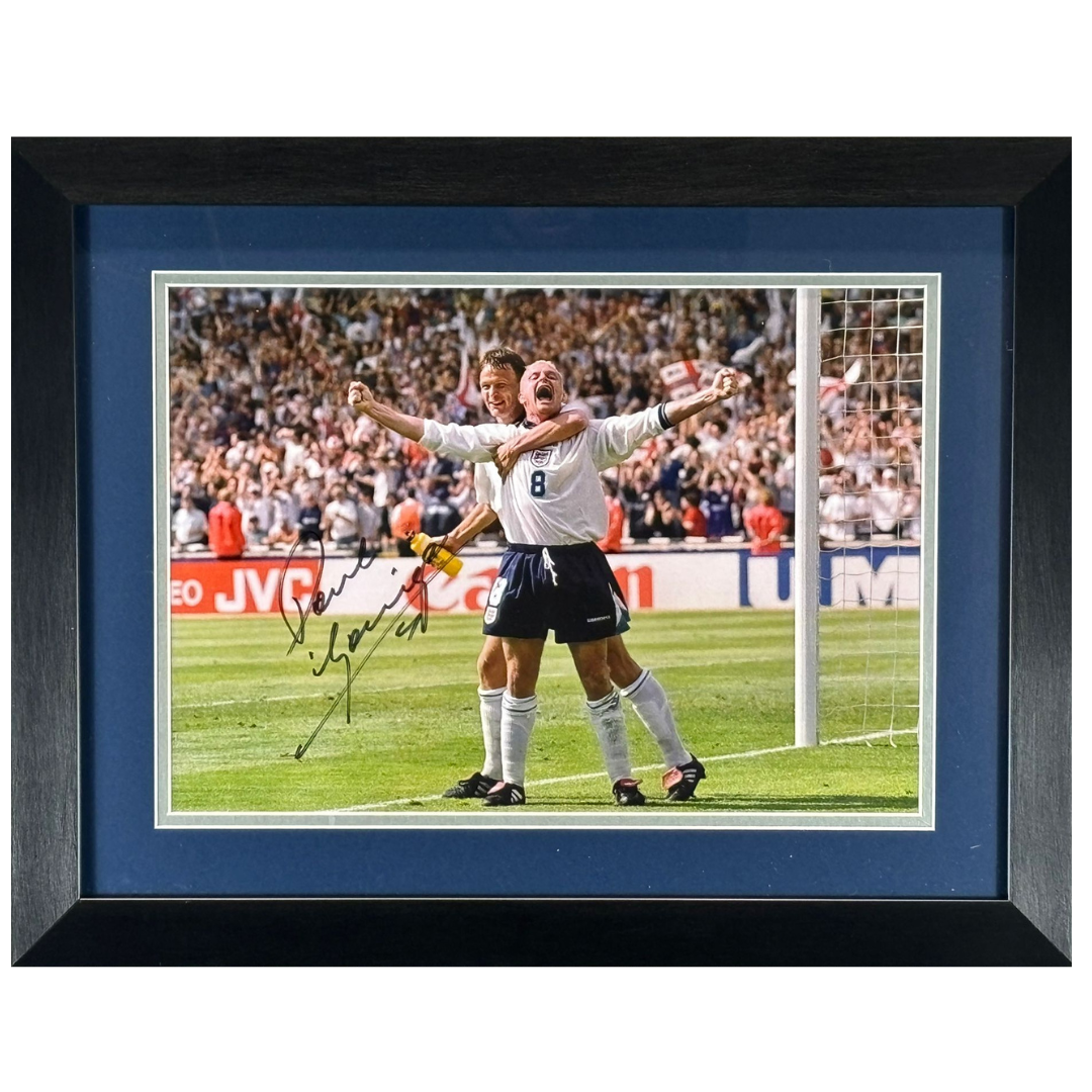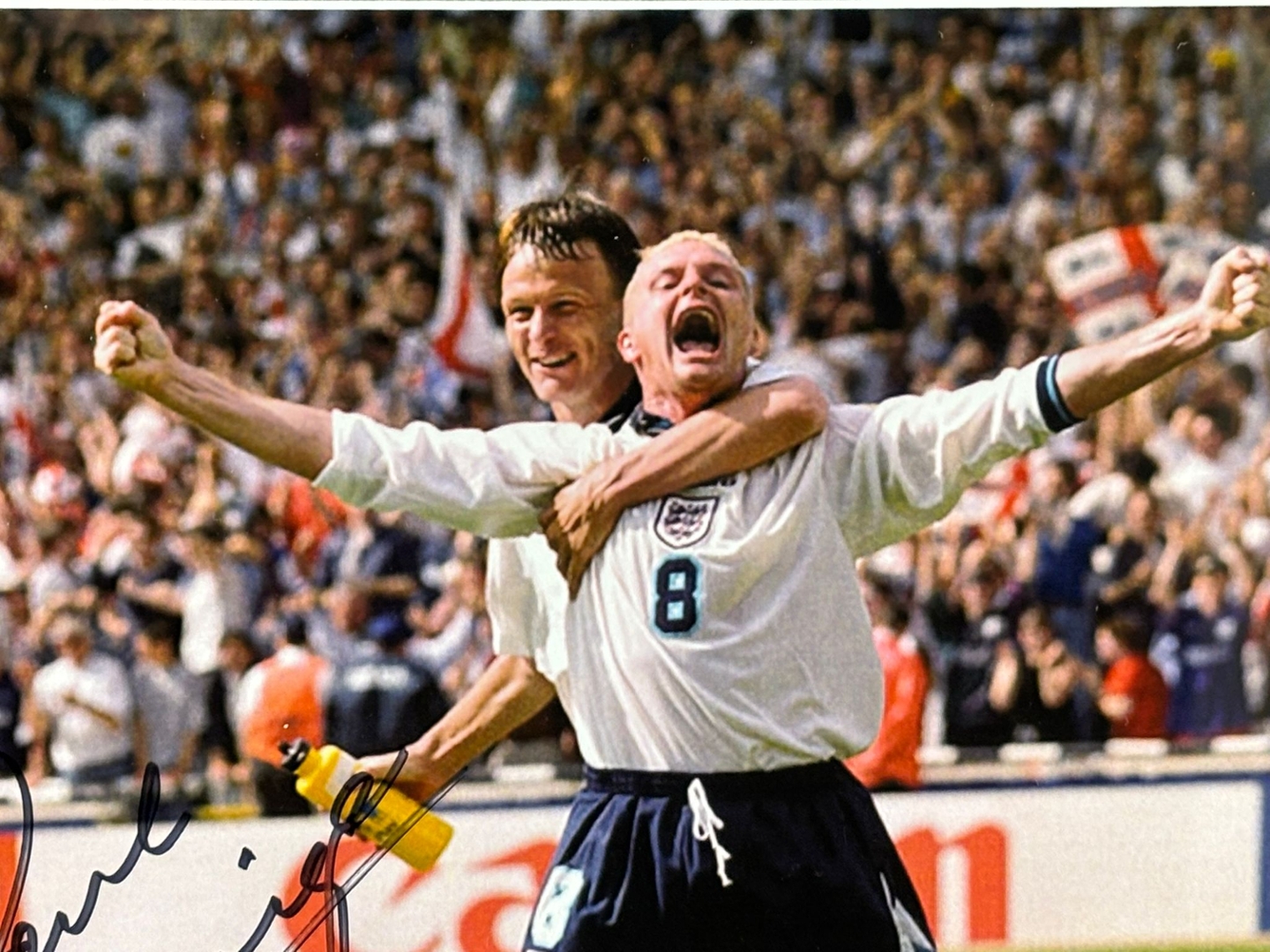 A signed and authenticated Paul Gascoigne England picture, beautifully presented in a frame measuring approximately 45cm high by 58cm wide. This dynamic image captures Gascoigne in one of his most celebrated England moments, full of emotion, energy, and the unmistakable passion that defined his career. His bold autograph sits clearly on the image, adding strong display value and making the piece instantly desirable to collectors.