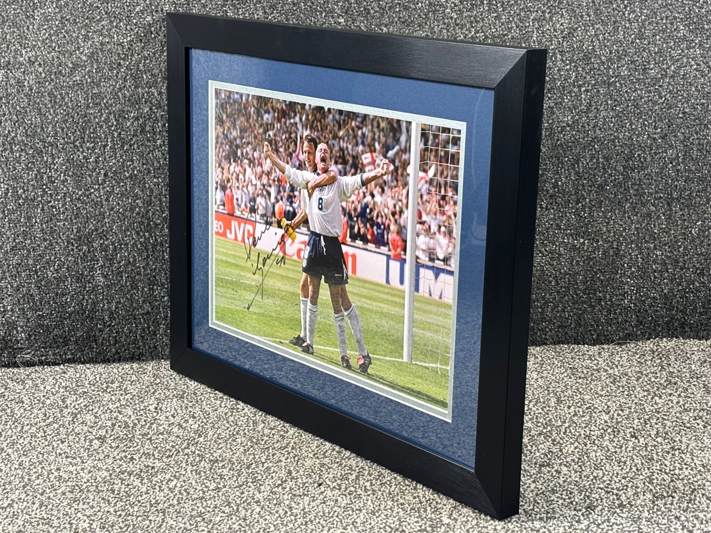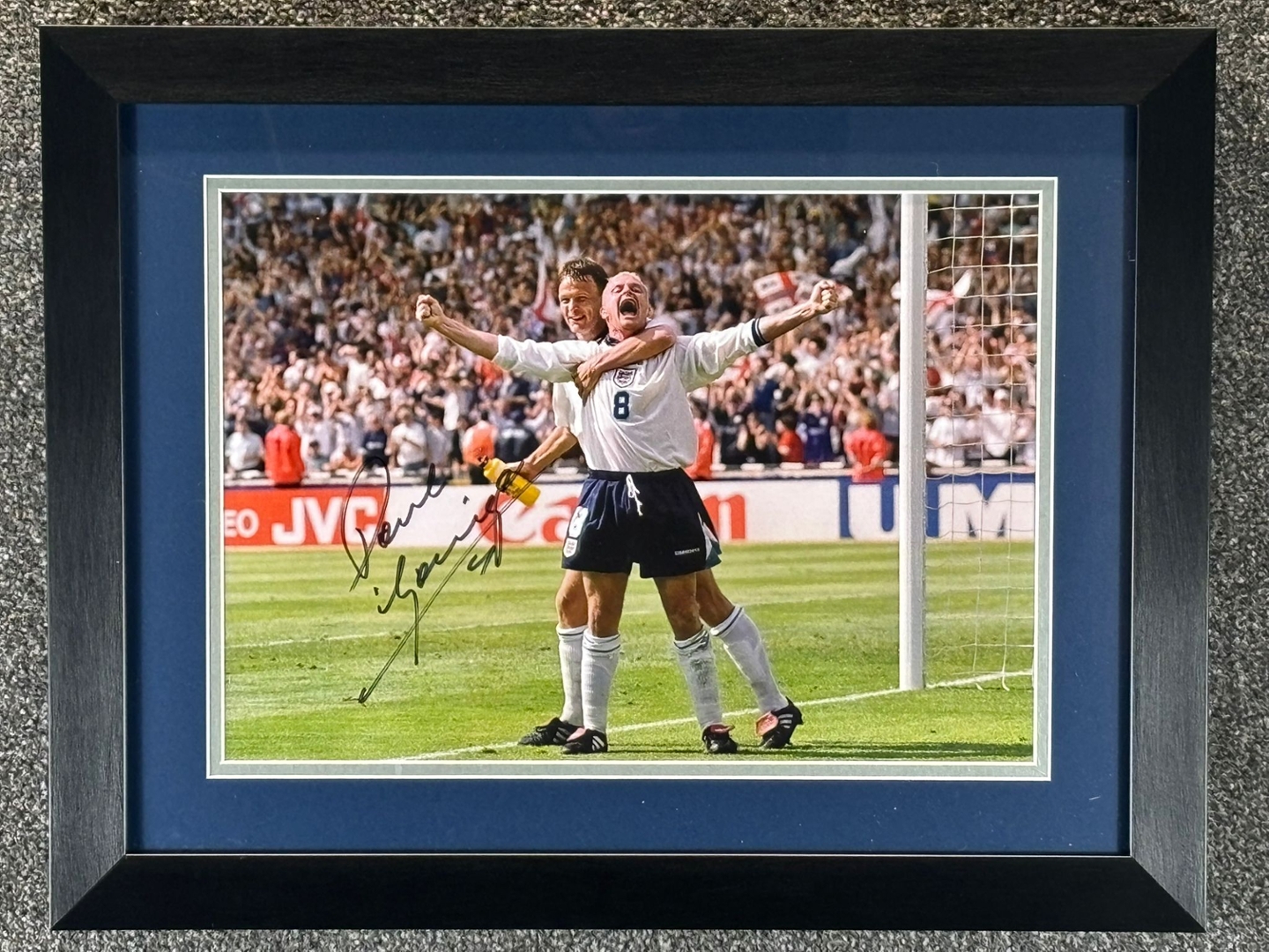 A signed and authenticated Paul Gascoigne England Picture in a presentation frame. Approx 45cm height, 58cm width.