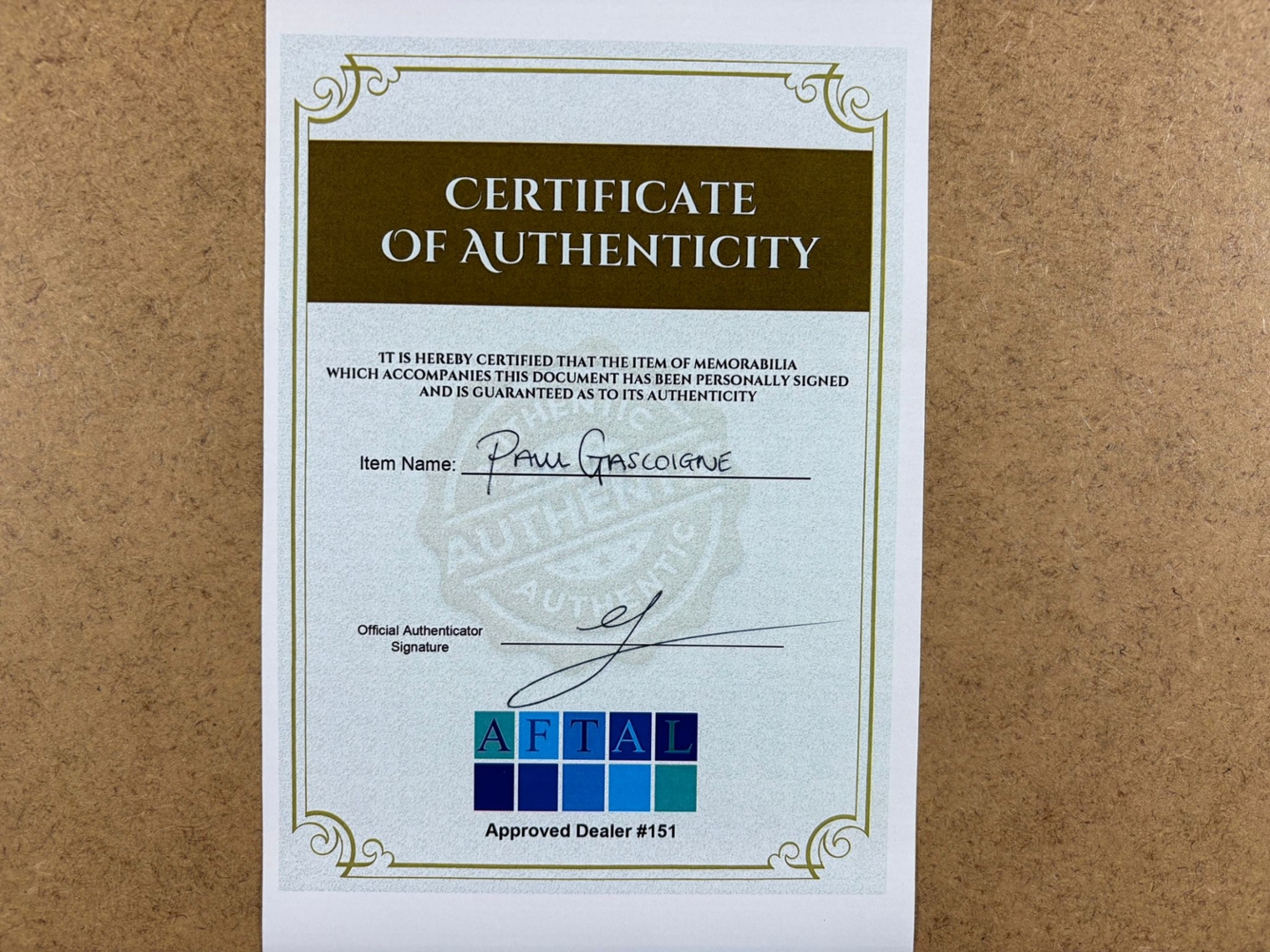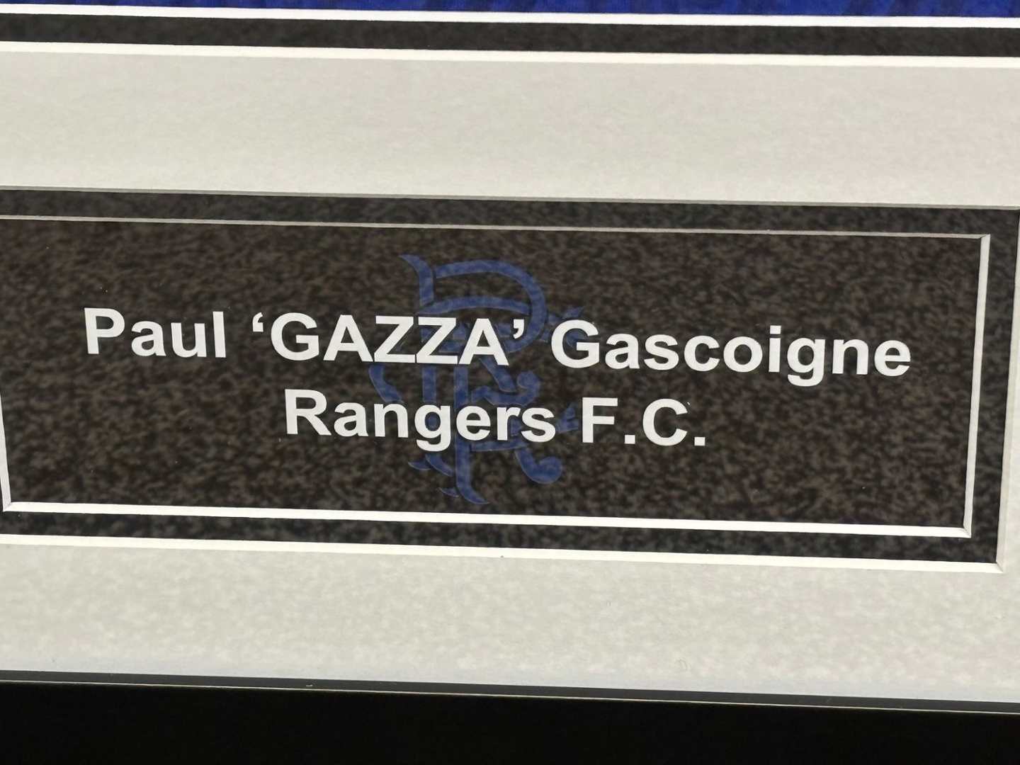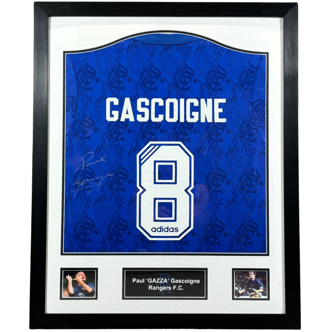 A signed and authenticated Paul Gascoigne Rangers shirt, showcased in a bold and stylish presentation frame. Revered by fans for his flair, passion, and unforgettable moments on the pitch, this display honours ‘Gazza’ during his thrilling spell at Rangers F.C., where he left an indelible mark on Scottish football.