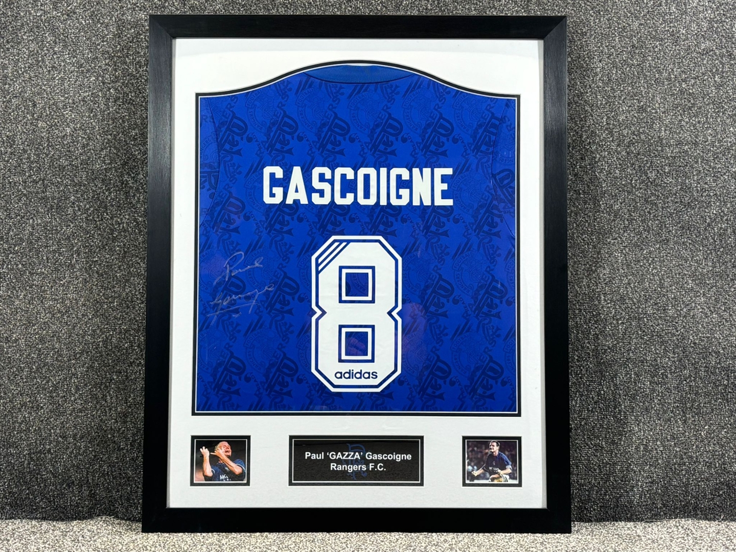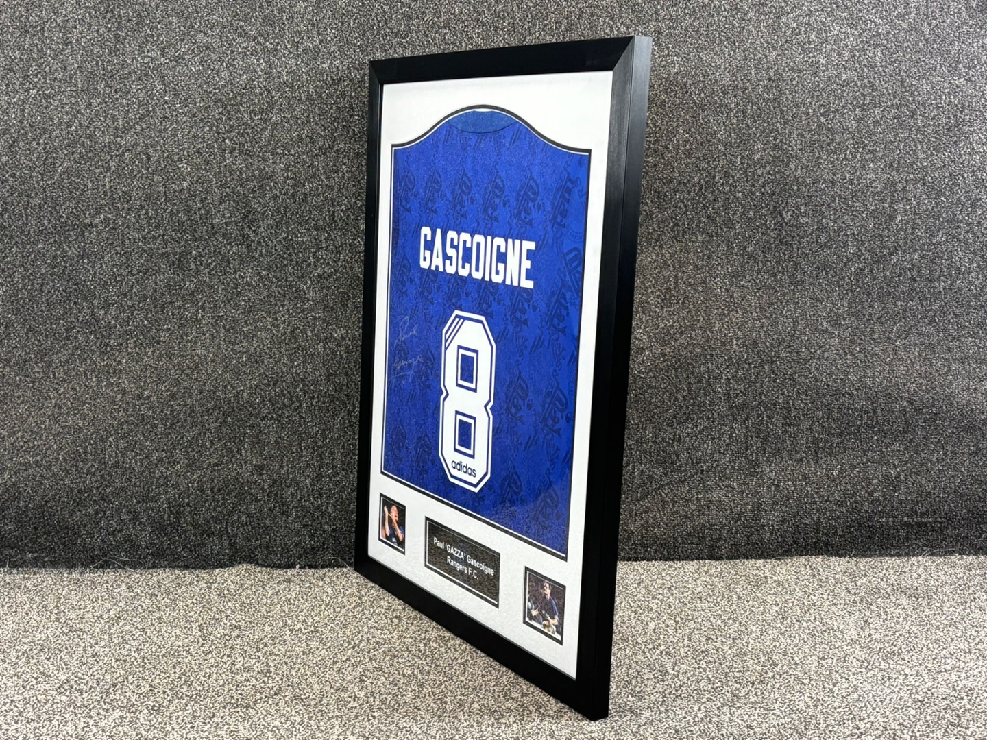 A signed and authenticated Paul Gascoigne Rangers Shirt in a presentation frame. Approx 83cm height, 68cm width.