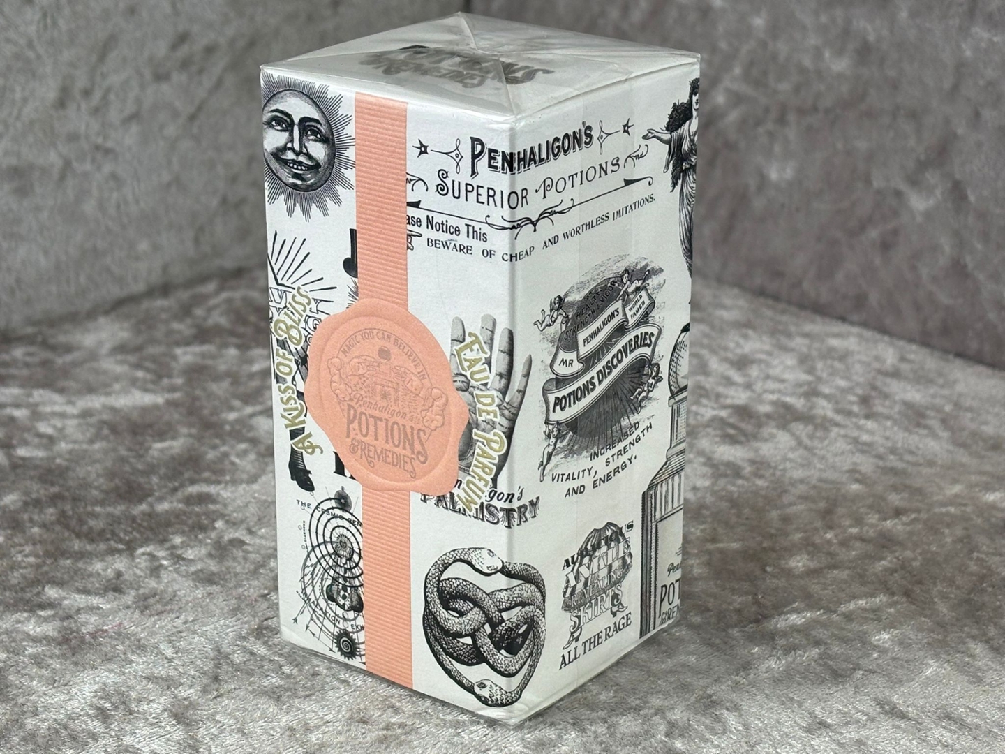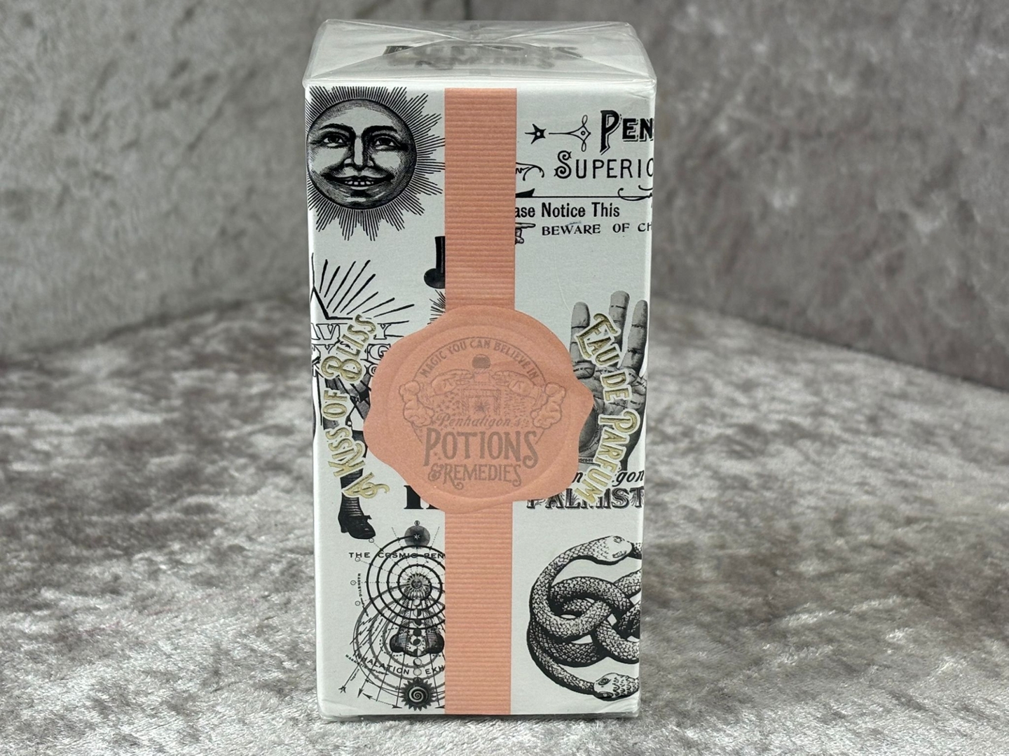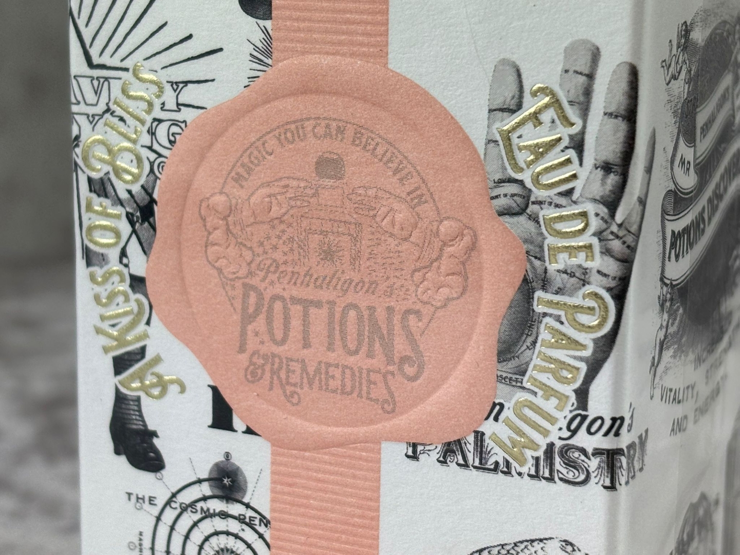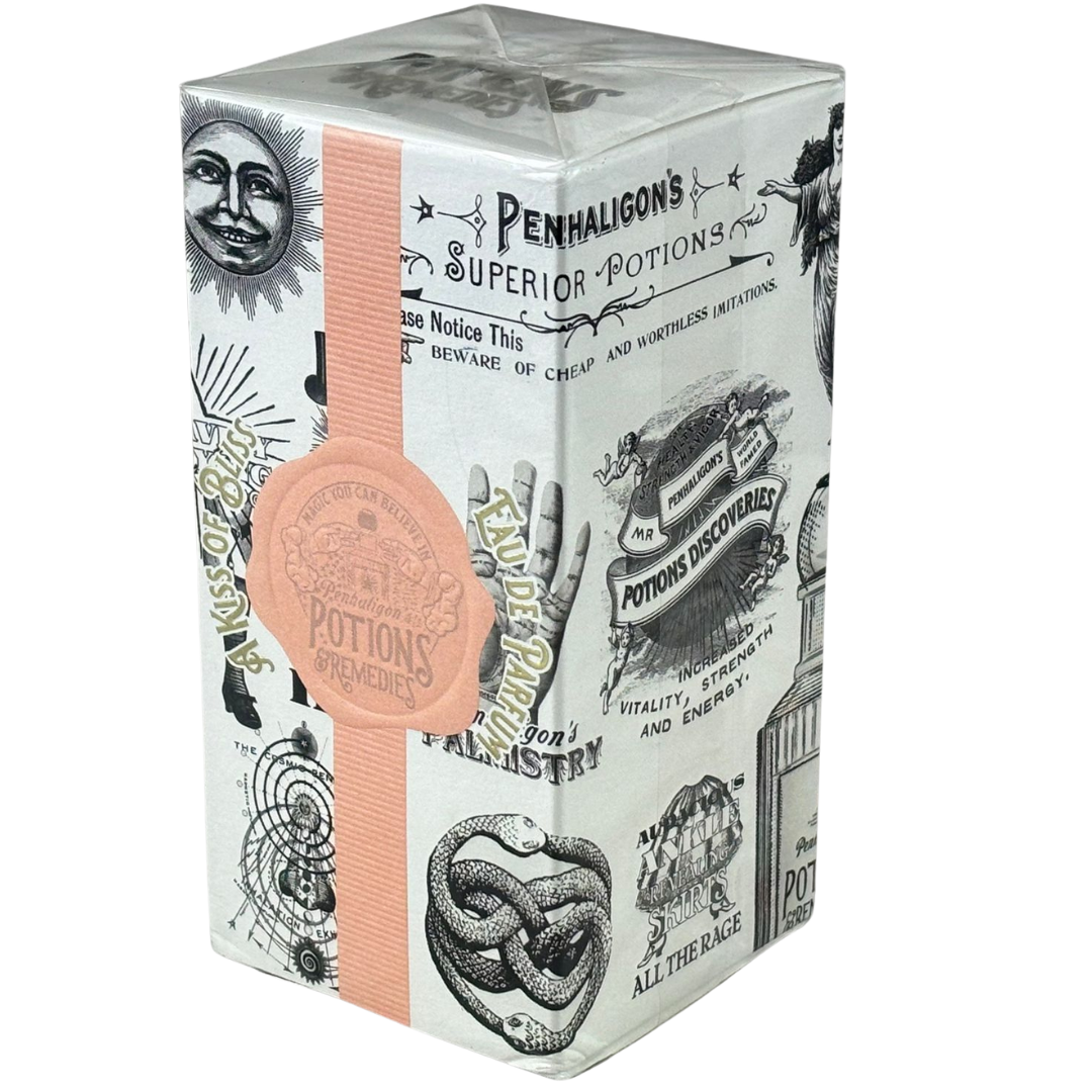 A bottle of Penhaligon's  Potions & Remedies A Kiss of Bliss Eau De Parfum in a presentation box.