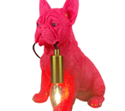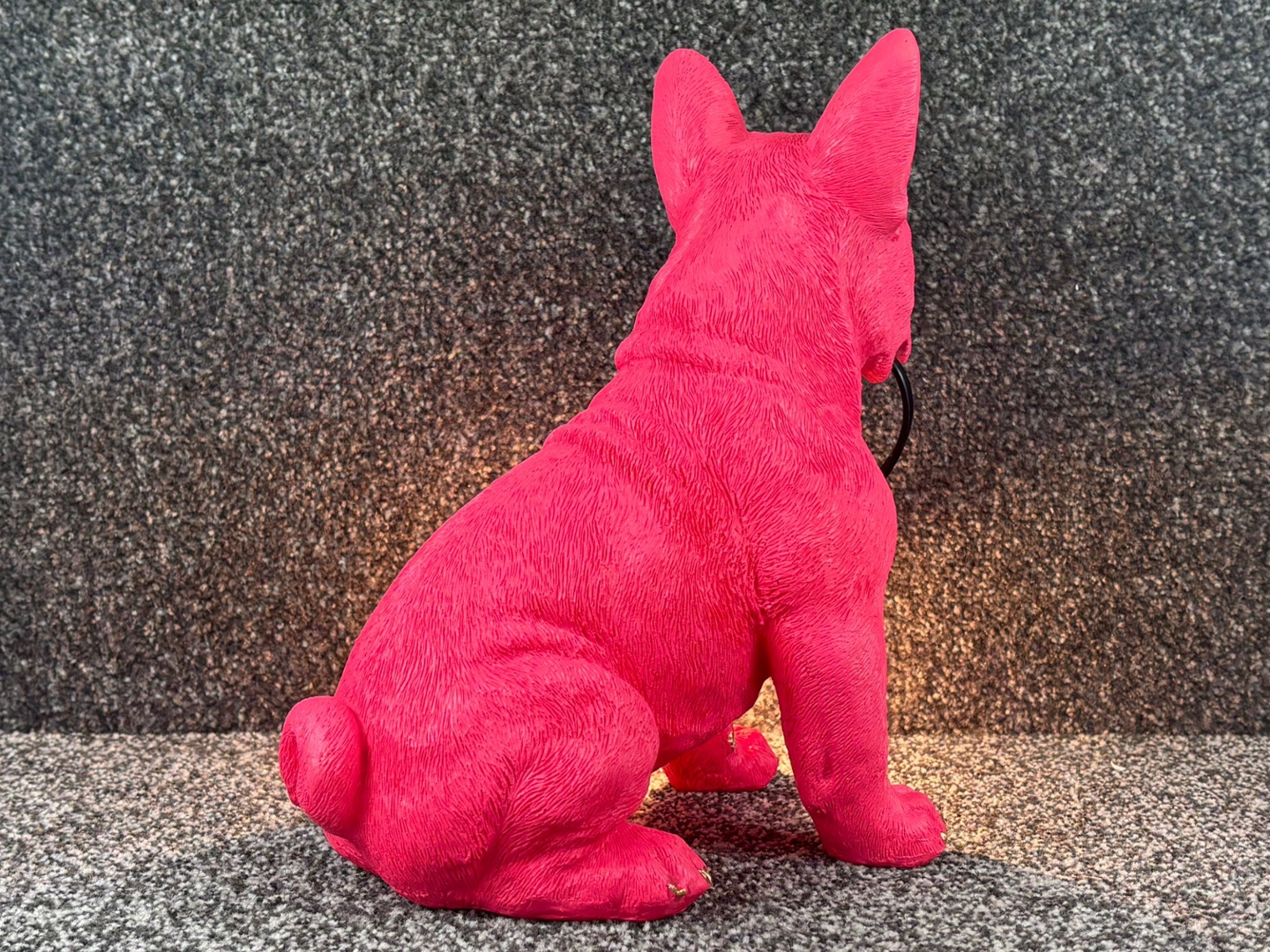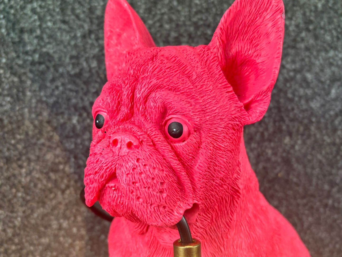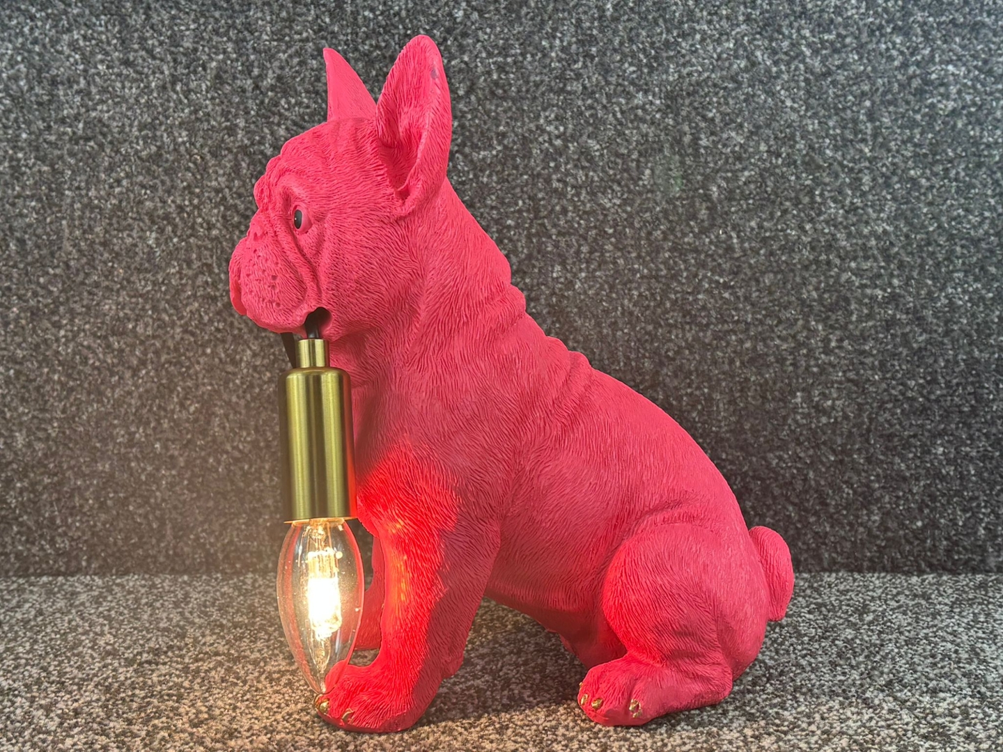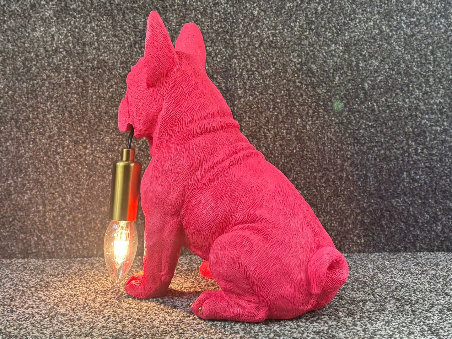 A pink sitting French Bulldog table lamp that combines playful charm with modern decorative flair. This quirky and eye-catching piece is designed in the shape of a French Bulldog holding a bulb fitting in its mouth, creating a fun yet functional lighting solution. The bold pink finish brings a vibrant pop of colour, while the intricate detailing on the fur and features captures the character of the beloved breed.