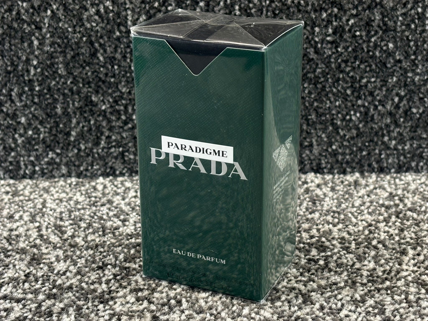 A bottle of Prada - Paradigme Eau De Parfum in a presentation box.