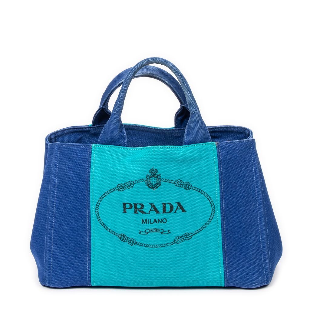 A vintage Prada royal blue/teal canvas Medium Bicolor Canapa Tote bag with a certificate of authenticity, Approximately 23cm height, 35cm width.