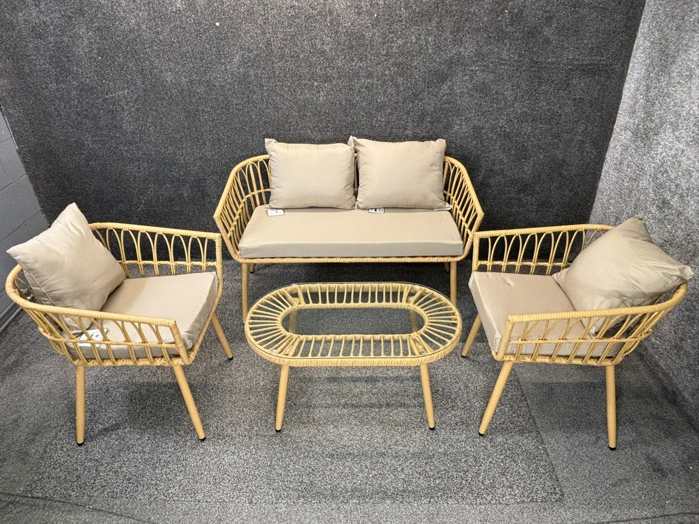 A four-piece rattan garden set is the perfect choice for outdoor relaxation and stylish entertaining. Beautifully designed with a natural woven effect, it includes a cushioned bench, two dining chairs, and a matching tempered glass table — creating a welcoming space for morning coffee, summer lunches, or evening gatherings.