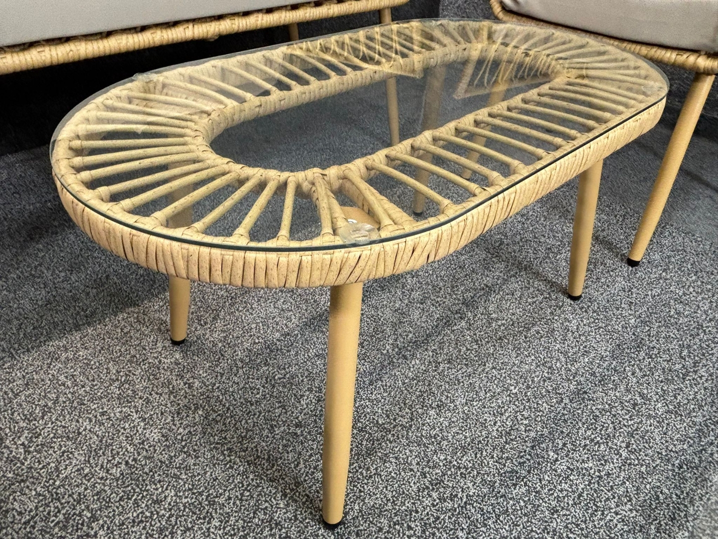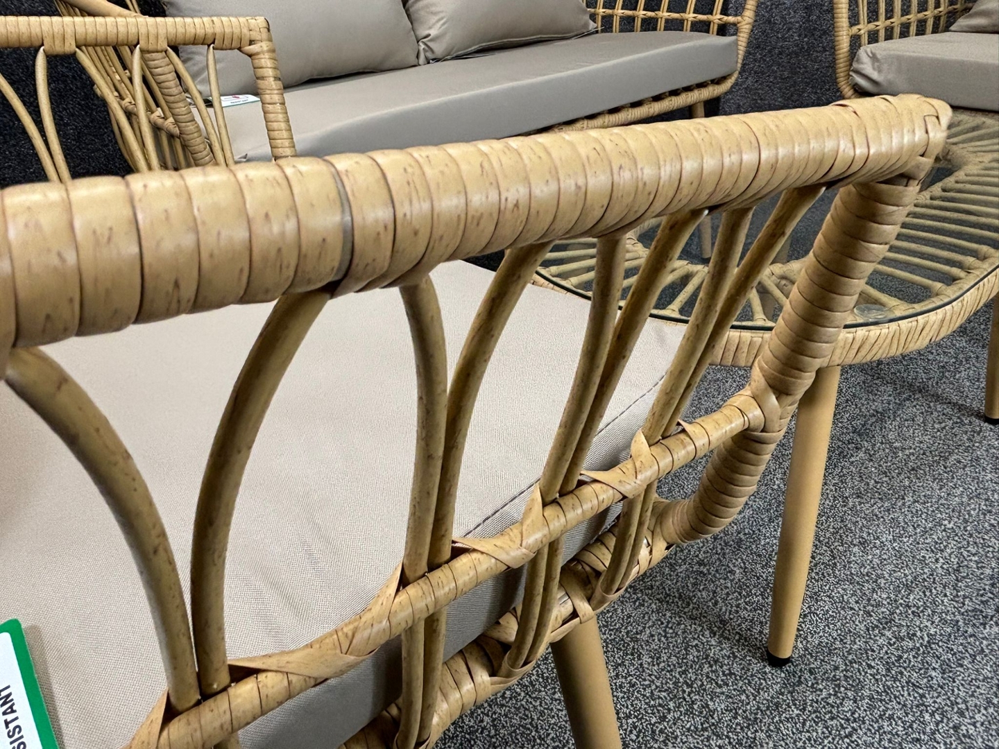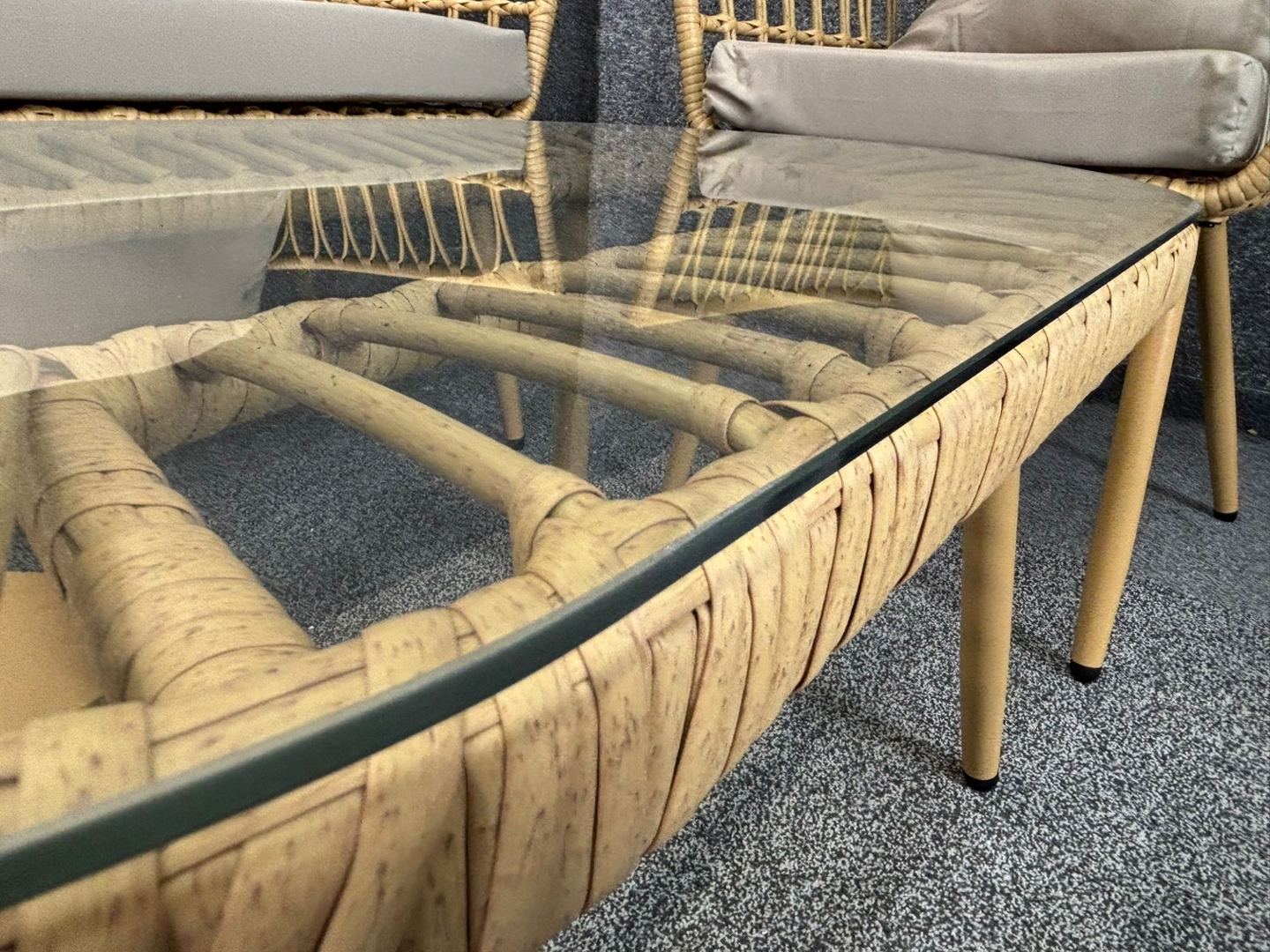 A Rattan Four Piece Garden Set, including a Cushioned Bench, 2 x Dining Chairs and a Tempered Glass Table