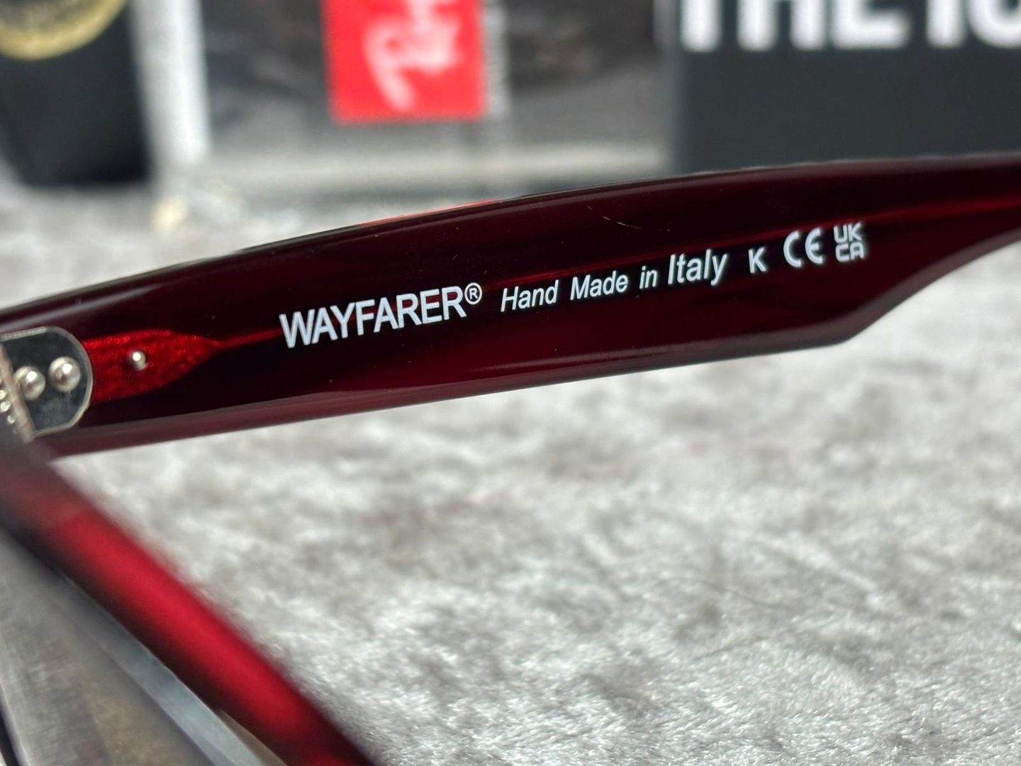 A brand new, unused and boxed pair of Ray-Ban RB2140 136285 sunglasses, showcasing a bold striped red and brown frame that delivers a striking and contemporary twist on a timeless silhouette. This distinctive colourway adds depth and personality while maintaining the instantly recognisable appeal of the classic Wayfarer design, making it a standout accessory for any collection.