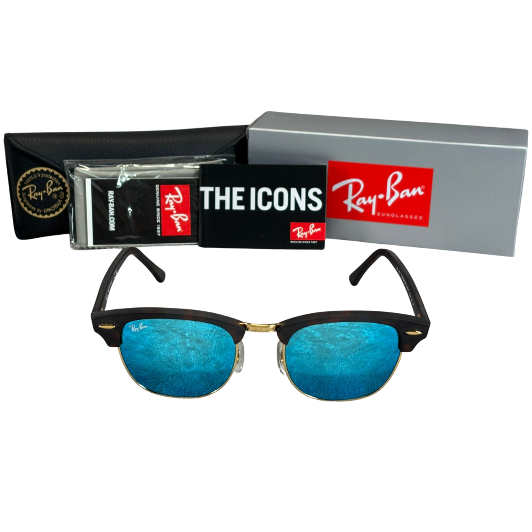 A brand new, unused and boxed pair of Ray-Ban RB3016 1145/17 Havana/Blue sunglasses, bringing a vibrant twist to one of Ray-Ban’s most iconic designs. The classic Clubmaster shape is elevated with a rich Havana frame paired beautifully with striking blue mirrored lenses, creating a bold, modern look while maintaining the timeless character the model is known for. With the Ray-Ban signature displayed on the lens, these sunglasses deliver unmistakable authenticity and style.